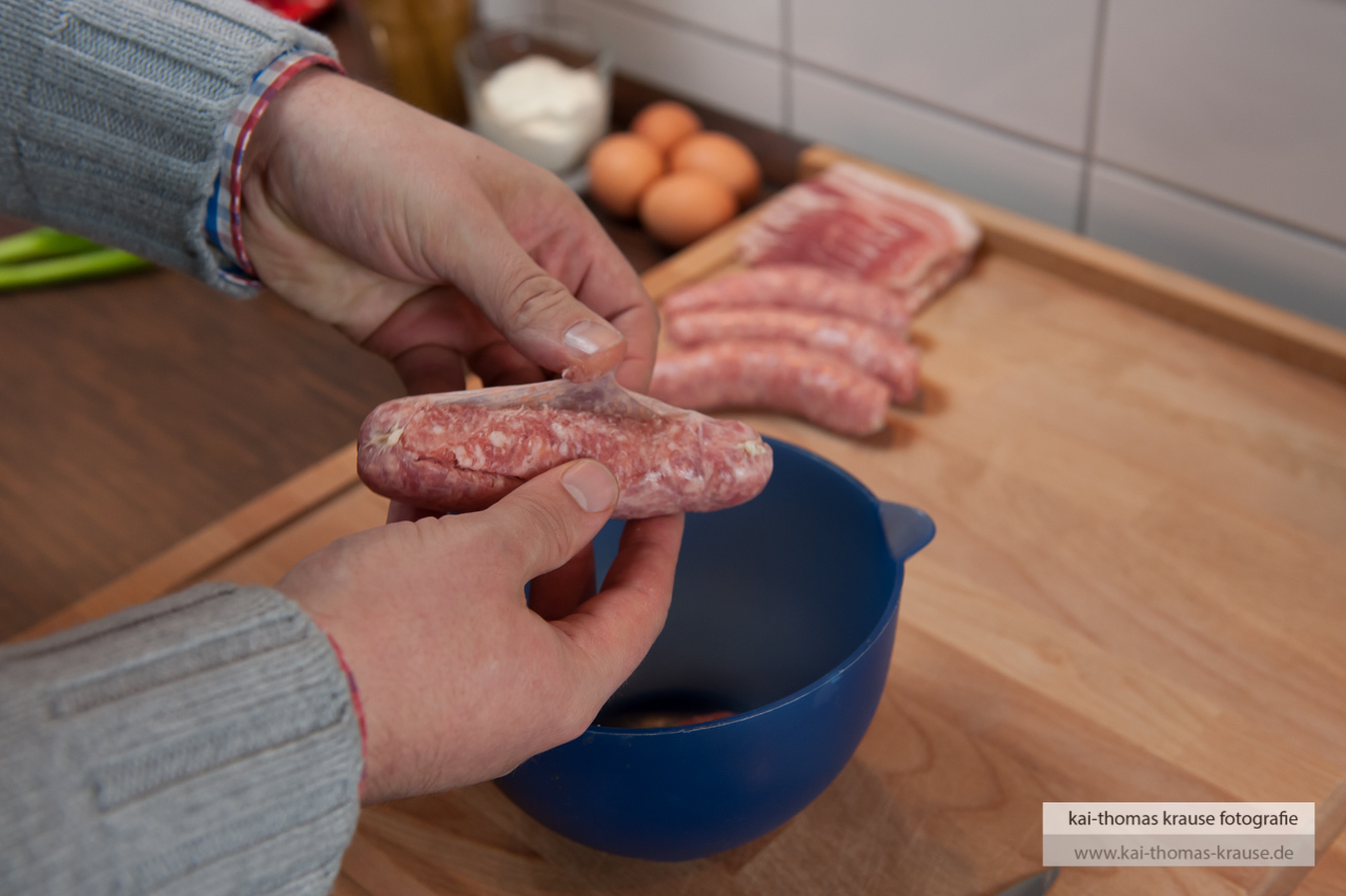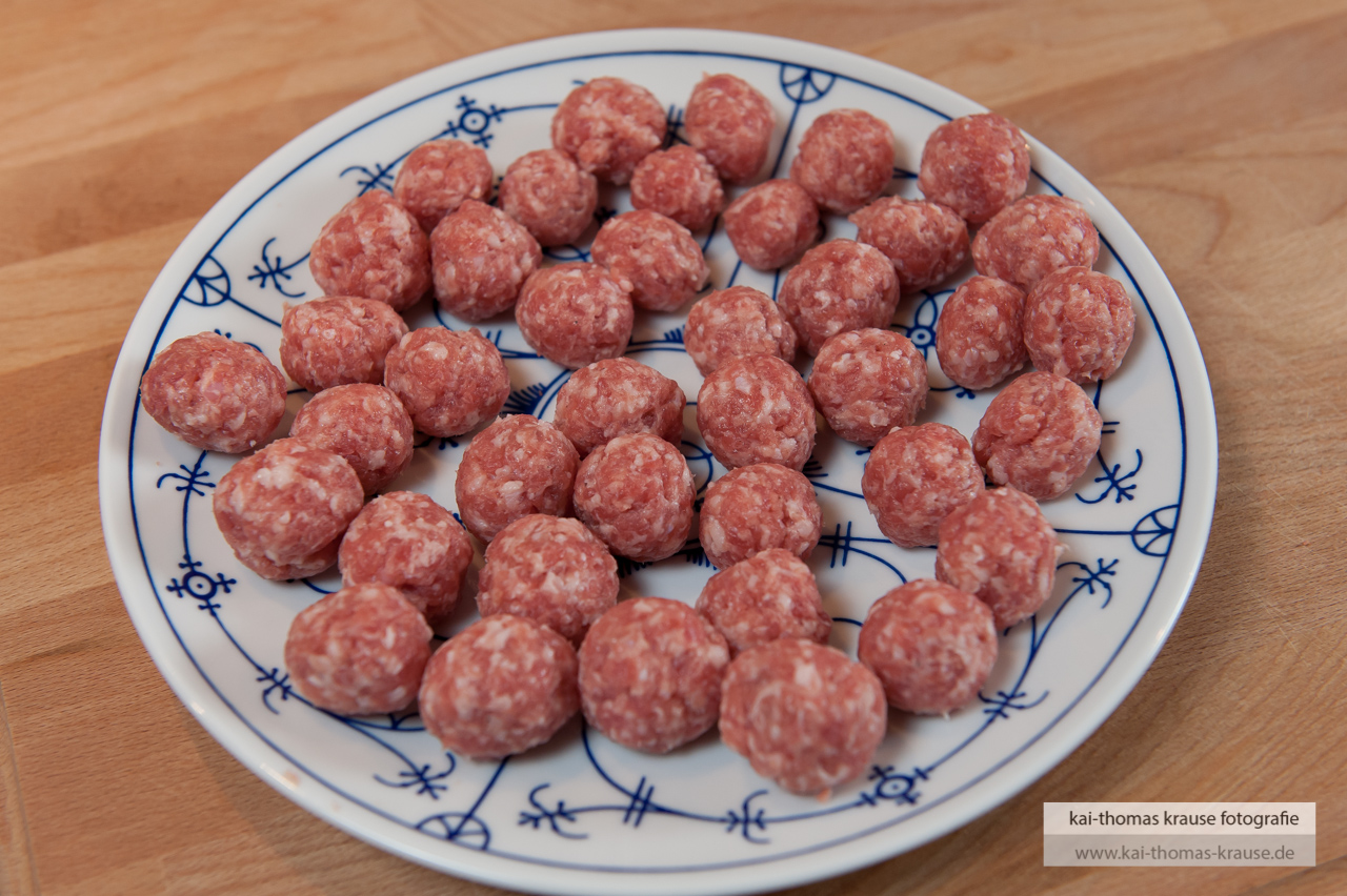 Die Bratwürste aufschneiden und das Brät in eine Schale geben. Gut vermengen und Kugeln der Größe von Murmeln formen. Mit einem guten Schuss Olivenöl in der Pfanne anbraten, bis sie goldbraun sind.