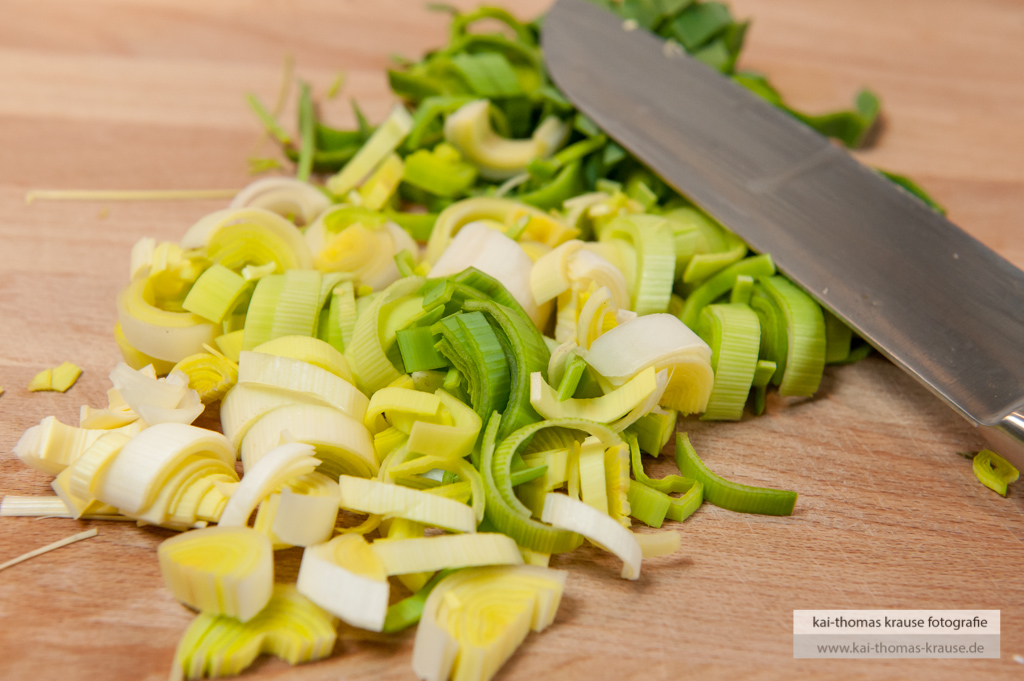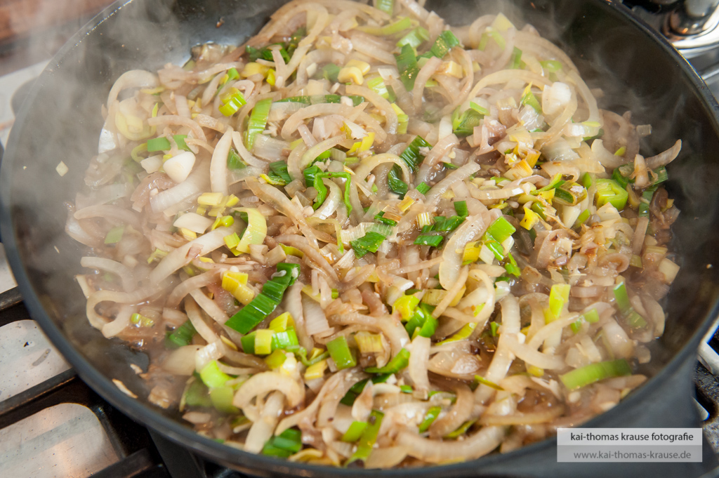 Wenn das Fleisch leicht angebräunt ist, aus der Pfanne nehmen und zur Seite stellen. Dann den Porree und die Zwiebeln klein schneiden. Ich halbiere beides und schneide dann Streifen herunter. Ebenfalls den Knoblauch klein schneiden. Dann mit noch etwas Öl die Zwiebeln kurz anschwenken, den Knoblauch dazu und schließlich den Porree dazu geben.