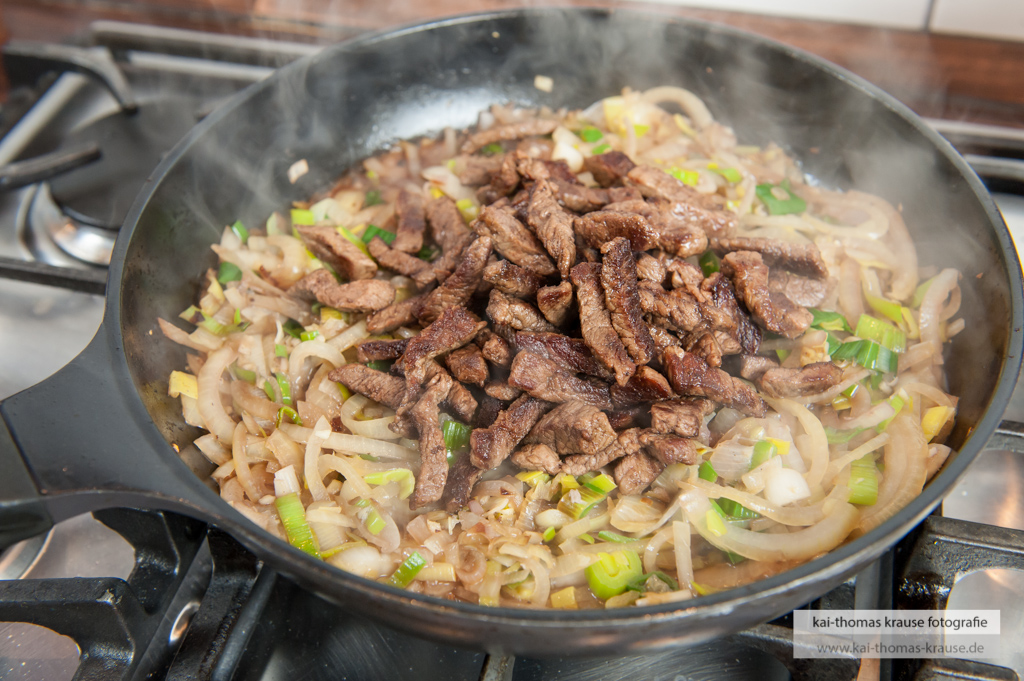 Das Rindfleisch in schön dünne Streifen schneiden. Eine Pfanne mit einem ordentlichen Schuss Sesamöl heiß werden lassen und die Rindfleischstreifen hineingeben, wenn das Öl richtig heißt ist. Die Temperatur ist super, wenn das Öl ganz leicht anfängt zu „qualmen“. Viele machen den Fehler das Fleisch anzubraten, wenn die Temperatur noch zu niedrig ist. Dadurch verliert das Fleisch aber viel Saft und die Poren können sich nicht schnell genug verschließen. Dadurch läuft es Gefahr zäh zu werden.