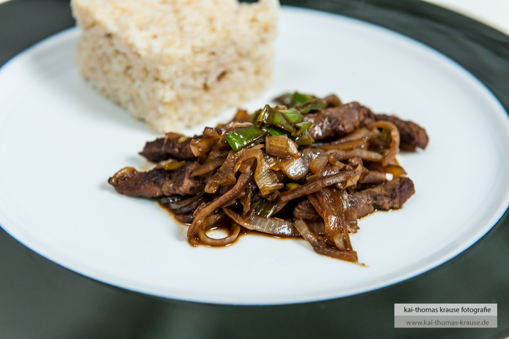 Dieses Rezept ist asiatisch angehaucht, aber noch ein wenig anders als man Rindfleisch mit Zwiebeln im Restaurant serviert bekommt. Es ist dankbarer Weise sehr schnell und unkompliziert zuzubereiten. Schlüssel ist dabei natürlich zum einen das Rindfleisch, zum anderen bestimmt aber auch der Reis den Geschmack stark. Ich mag z.B. Naturreis sehr viel lieber als Basmati oder ähnliches, weil der Reis selber eben einen starken Eigengeschmack hat. Auch hier gilt wieder mal: Ausprobieren macht klug! Was das Rindfleisch angeht, so setze ich eigentlich konsequent auf Rumpsteak, das ich in der Regel in einem 2,5kg Stück vom Großhandel besorge. Ich Verarbeite ich dann in sinnvolle Portionen und Vakuumiere diese zum Einfrieren ein.