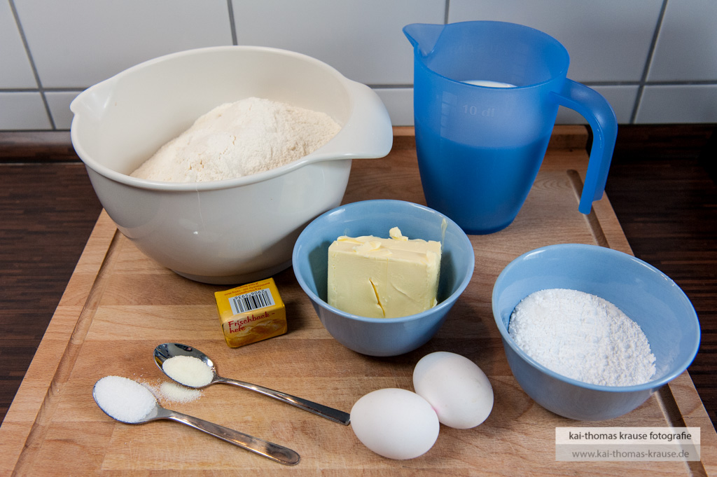 Man nehme ein großes Glas oder eine kleine Schüssel. Darin 100ml von der Milch lauwarm werden lassen. Die Hefe hinein bröseln und gut verrühren, dann den Zucker darin auflösen. Das Ganze für gute 10 Minuten an einen warmen Ort stellen. Bei uns ist es immer die Heizung. Und bitte das Gefäß groß genug wählen – diese Mischung kann bis zum 3 fachen ihres Ausgangsvolumens groß werden.