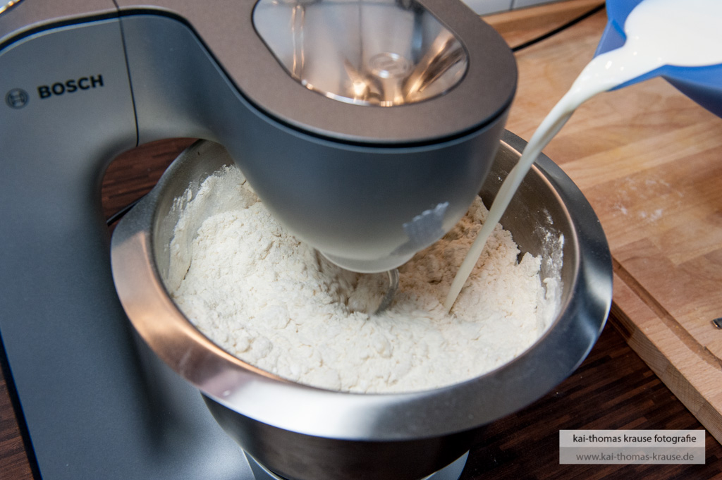Dann die Milch dazu und die Mischung mit Knethaken und Rührgerät (hier wieder mein dezenter Hinweis auf die Anschaffung einer Küchenmaschine) zu einem geschmeidigen Teig verrühren. Wenn sich der Teig beim Rühren von selbst schon vom Schüsselrand löst, die restliche Butter Esslöffelweise zugeben und einarbeiten.