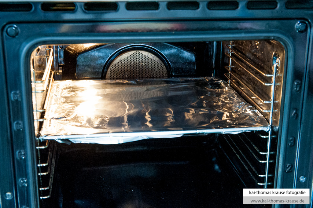 Das ganze Backblech mit Alufolie abdecken und im Backofen auf der mittleren Schiene platzieren. Bei 180 Grad Ober- und Unterhitze für ca. 50 Minuten backen. Mit beliebigen Beilagen, wie z.B. einer Sauce Hollandaise servieren.