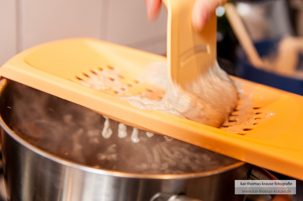 Dabei nicht strikt an die Wasservorgabe halten – der Teig muss geschmeidig sein und nicht zu fest, aber auch nicht zu flüssig. Als Maßgabe schaut Euch den Spätzleschaber an: dort darf der Teig nicht durch fließen, muss aber einfach durchgeschabt werden können.