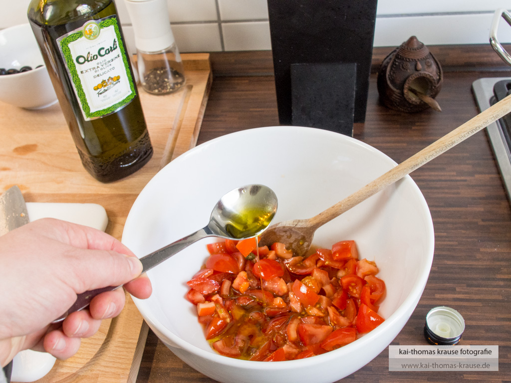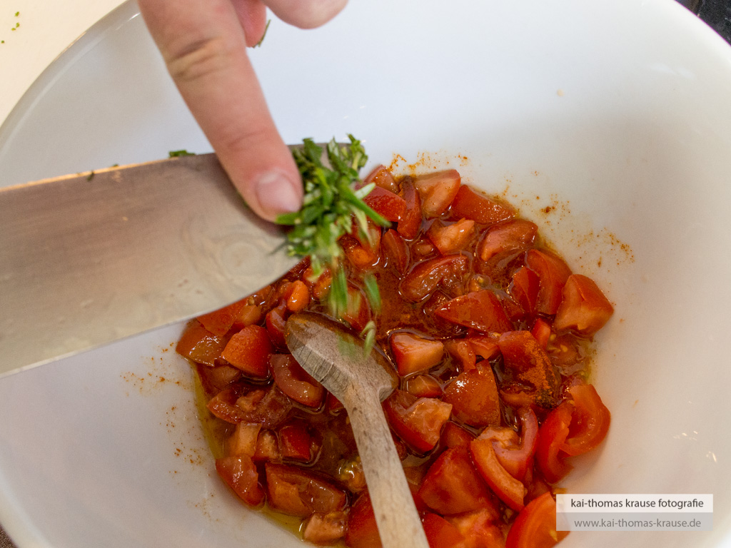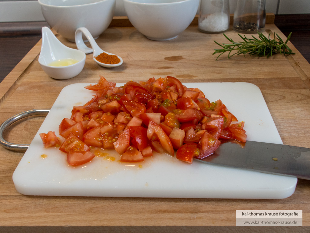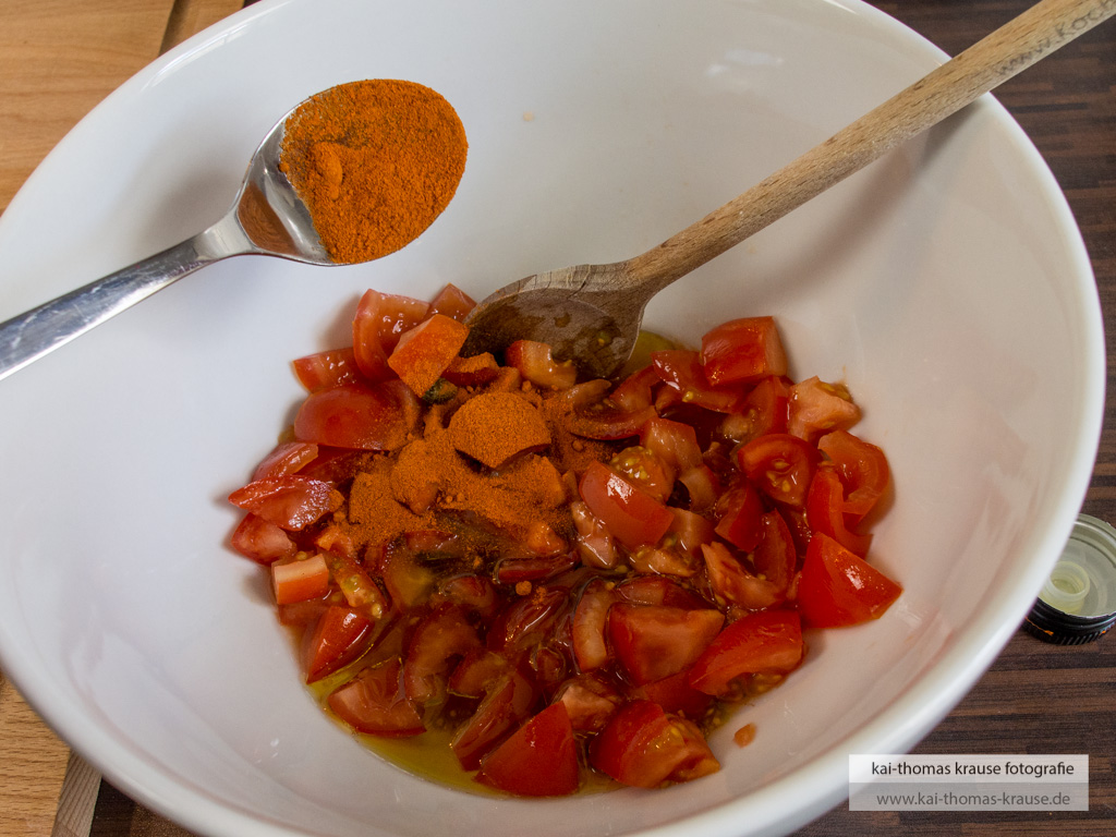 Die gewürfelten Tomaten in eine Schale geben, mit dem Olivenöl und dem Paprikapulver vermischen.