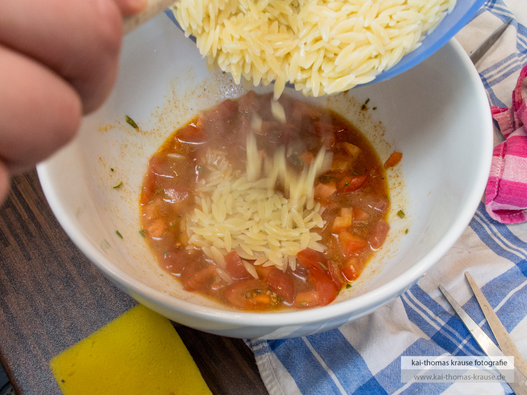 Die Risoni nach Packungsanleitung kochen. Derweil die Tomaten in Würfel schneiden.
