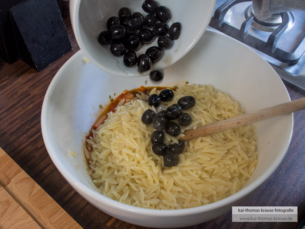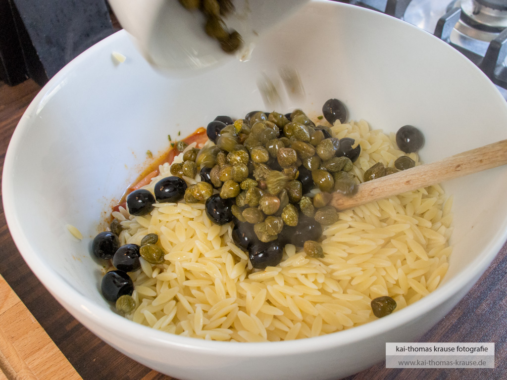 Oliven und Kapern untermischen, mit Salz, Pfeffer, Zitronensaft und ggf. Saft der eingelegten Kapern abschmecken.