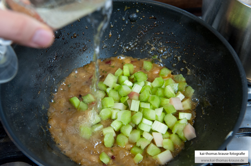 Den Rhabarber schälen und dann in kleine Würfel schneiden, beiseite stellen. Dann die Schalotten und den Knoblauch in kleine Würfel hacken und mit mit einem guten Schuss Öl in einer Pfanne anbraten.