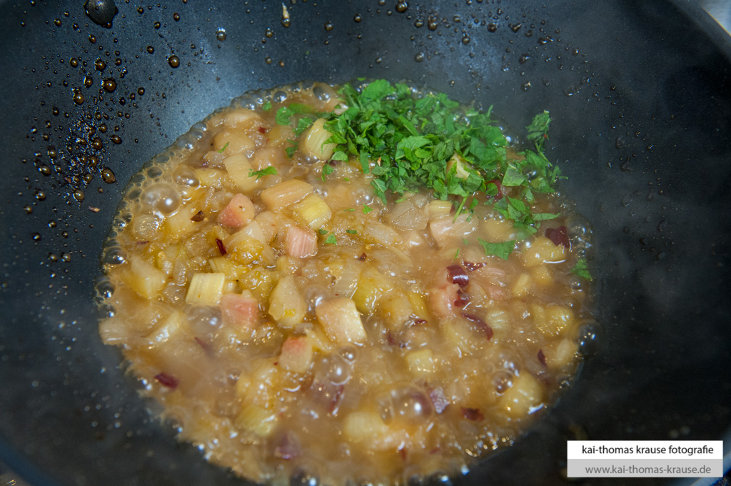 Die Chillis dazu geben. Dann den Zucker dazu geben und das Ganze karamellisieren lassen, dabei aber aufpassen, dass das es nicht zu braun wird. Mit dem Balsamico Essig ablöschen und die Hälfte der Rhabarberwürfeln dazu geben.