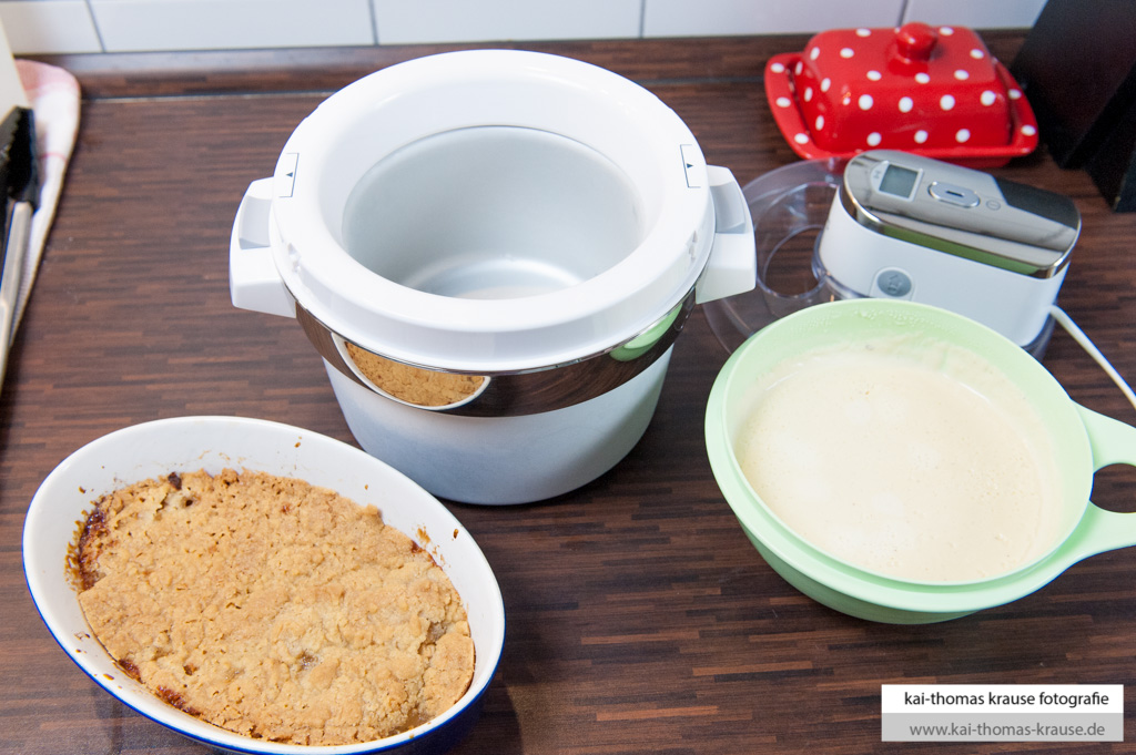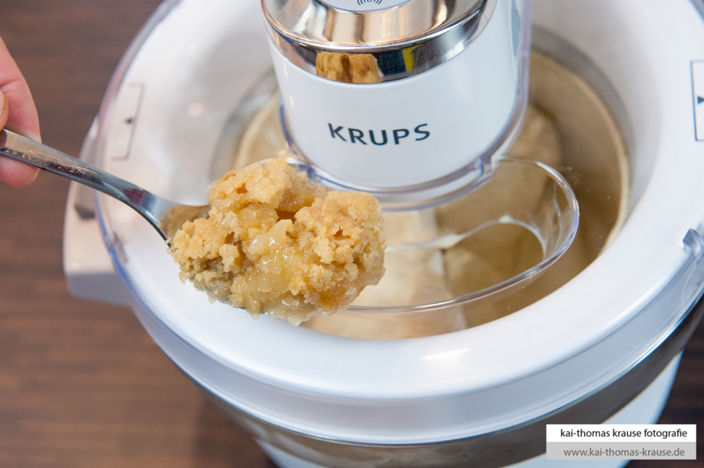 Bei meinem Modell gebe ich nach etwa 20 Minuten dann den Apple Crumble löffelweise dazu. Von der in meinem Rezept beschriebenen Menge kommt etwa die Hälfte in die Eismasse, der Rest wird hinterher als Beigabe zum Eis mit serviert. Dann die Maschine Ihr Programm zu Ende machen lassen. Die Eiscreme frisch servieren und den nicht gebrauchten Rest (kann so was überhaupt vorkommen???) am besten sofort ins Tiefkühlfach, damit die Konsistenz schön cremig bleibt. Wartet man zu lange, friert das Eis hart ein.