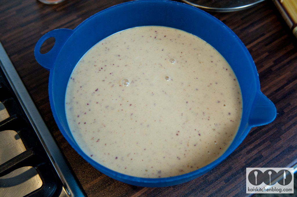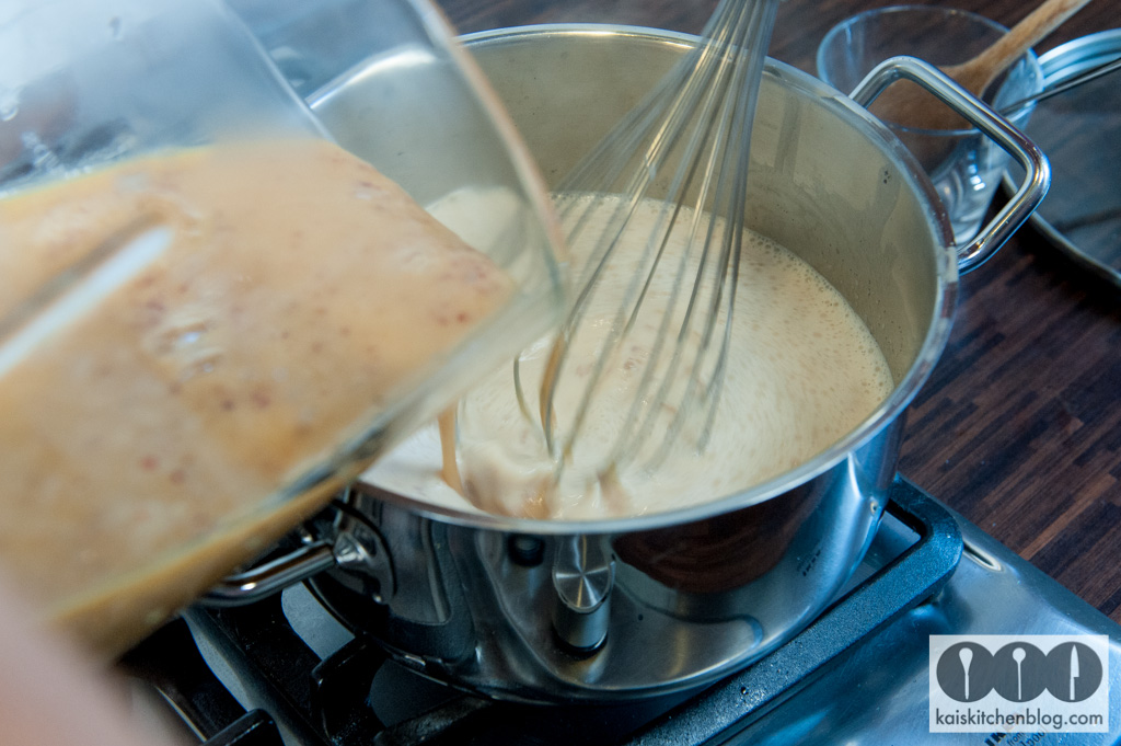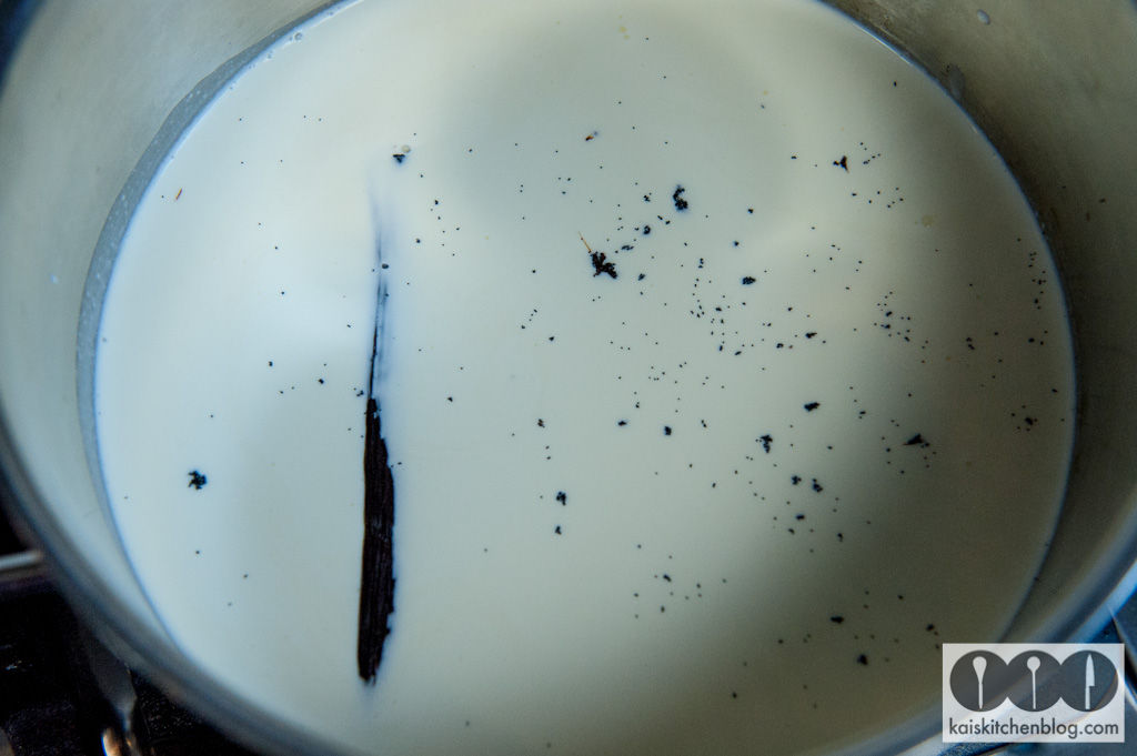 Die Sahne in einen Topf geben und auf kleiner Flamme erwärmen, aber nicht kochen. Die Vanilleschote aufschneiden und das Mark herauskratzen, mit in den Topf geben. Wenn die Sahne warm ist, den Zucker mit in den Topf geben und mit einem Schneebesen gut durch rühren.