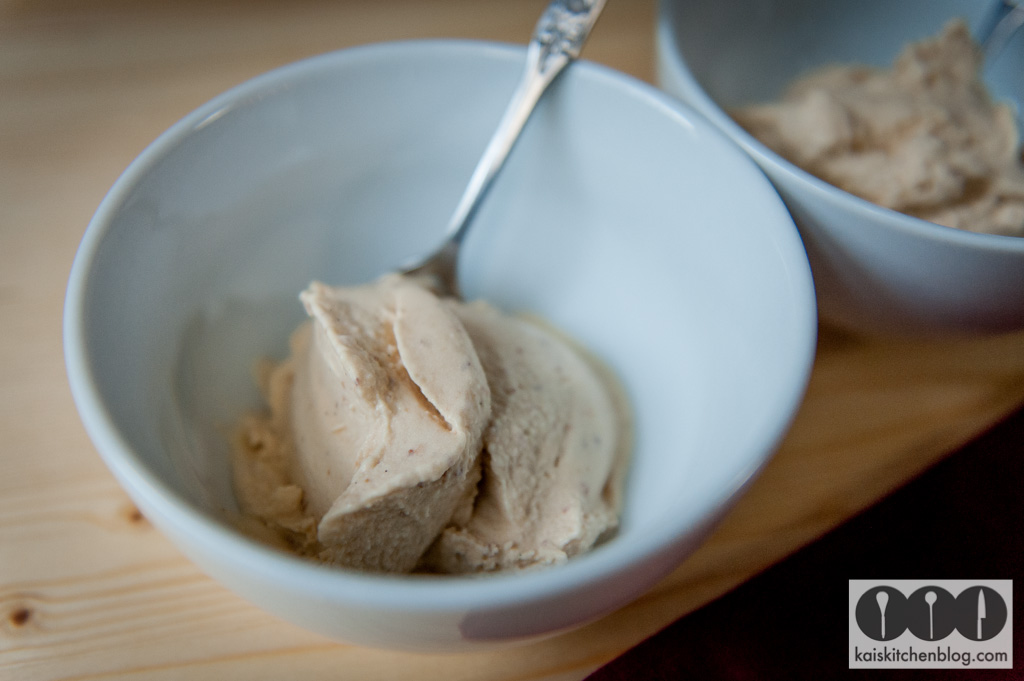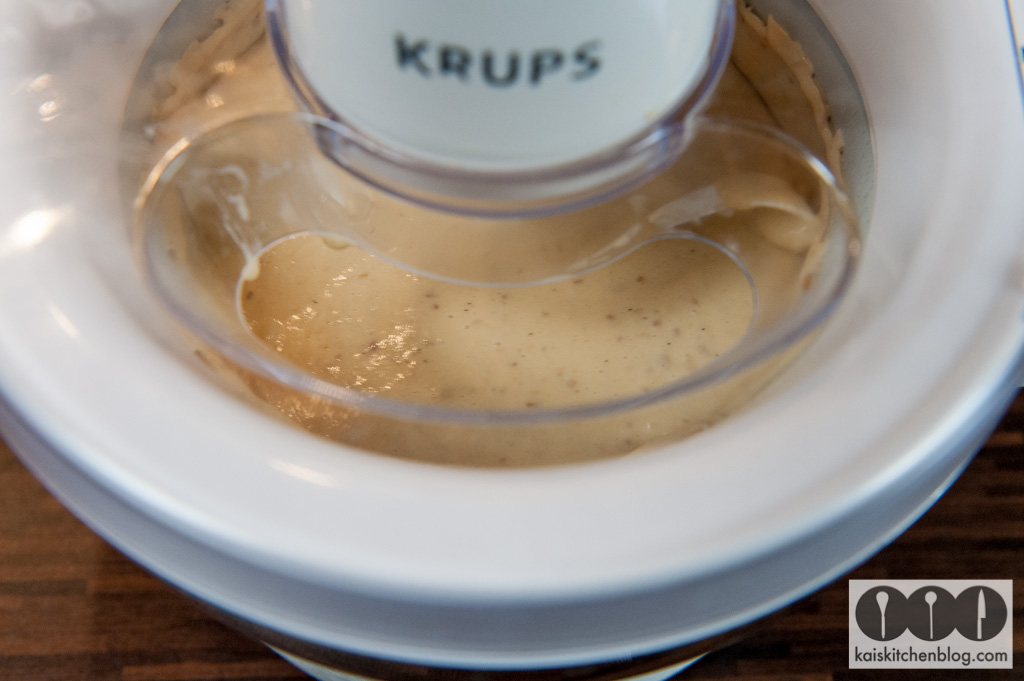 Die Eismaschine nach Bedienungsanleitung vorbereiten und die Eismasse hineingeben. Warten bis das Eis fertig ist – genießen 🙂