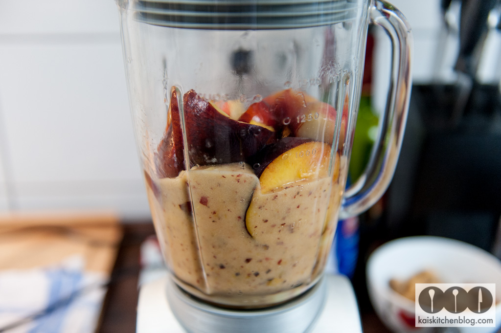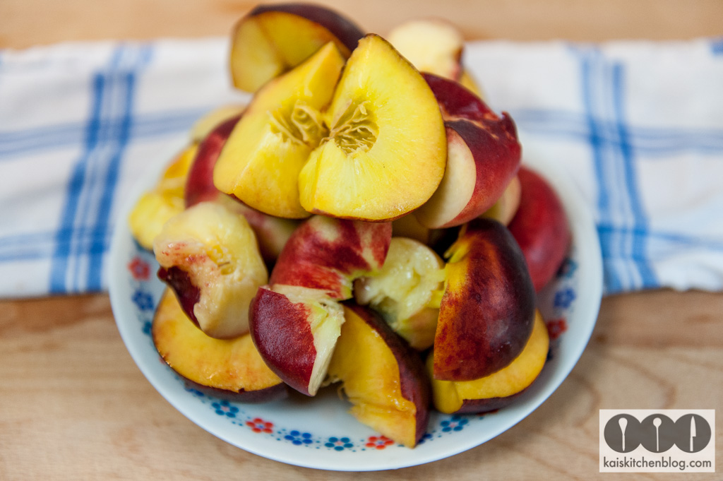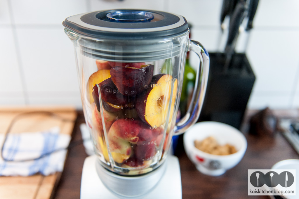 Die Pfirsiche halbieren und entkernen. Dabei darauf achten, dass keine Kernrest zurückbleiben. Gerade bei reifen Pfirsichen sind die Kerne schon mal geöffnet.