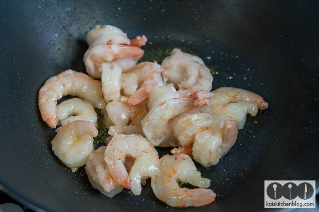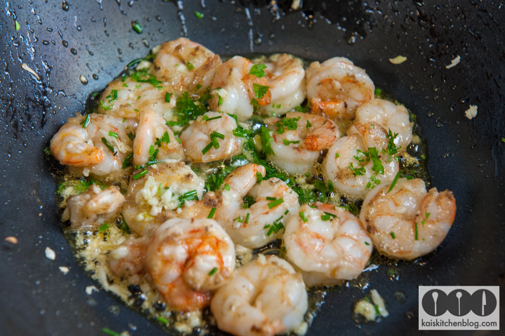 Knoblauch, Schnittlauch und Petersilie schön fein hacken. Die Garnelen mit dem Olivenöl in der Pfanne anbraten. Wenn sie schon leicht angebräunt sind, erst den Knoblauch dazu geben und einen Moment mit braten. Dann Schnittlauch und Petersilie dazu geben. Mit dem Balsamico Essig und dem Apfelsaft ablöschen. Noch einen Moment einreduzieren lassen.
