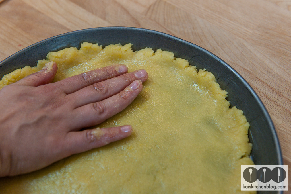 Das Mehl, den Zucker, die Butter, das Eigelb und die Prise Salz in eine Rührschüssel geben und gut zu einem Teig verkneten. In eine Tarteform geben und darin mit einem Rand gleichmässig verteilen. Dann abdecken und für 30 Minuten in den Tiefkühler stellen.