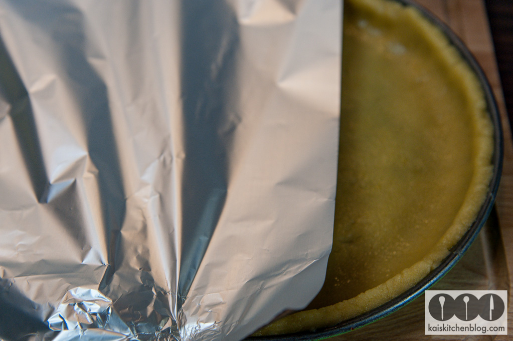 Dann den Teig mit der Alufolie in den Backofen geben. Dieser sollte auf 180 Grad vorgeheizt sein. Für 25 Minuten backen und dann die Alufolie abnehmen und weitere 8 Minuten backen. Aus dem Ofen nehmen und beiseite stellen.