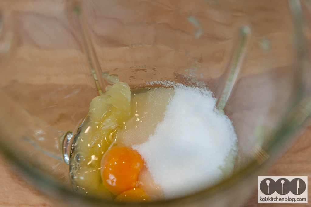Die Zitronenfilets, die Eier, die Eigelbe und den Zucker in einen Küchenmixer geben und fein pürieren (kann man auch mit dem Pürierstab machen). Dann die Sahne und die geriebene Zitronenschale mit in den Mixer geben und noch mal gut vermengen.