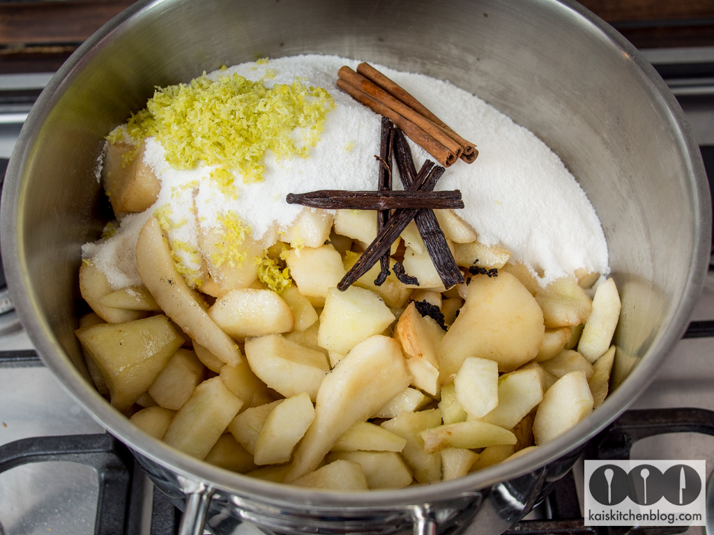Die Birnen schälen und entkernen. Grob klein schneiden und in einer Schale zwischenlagern. Das Mark aus den Vanilleschoten kratzen und in einen Topf geben. Die Schoten halbieren und behalten.