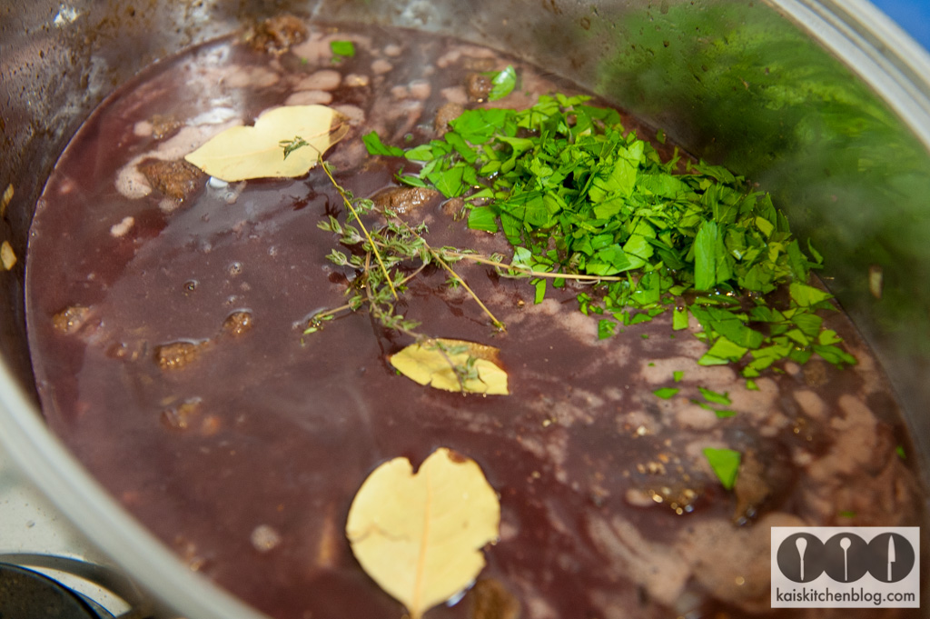 Auch den Thymian, die Lorbeerblätter und die Petersilie dazu geben und gut unter rühren. Dann das Ganze auf kleiner Flamme für gut 2 Stunden köcheln lassen und gelegentlich umrühren. Wenn die 2 Stunden um sein ein Stück Fleisch prüfen, ob es gar und zart ist (sollte es sein, ansonsten noch eine halbe Stunde weiter garen, aber aufpassen, dass genug Flüssigkeit im Bräter ist). Dann die Schalotten schälen und halbieren.