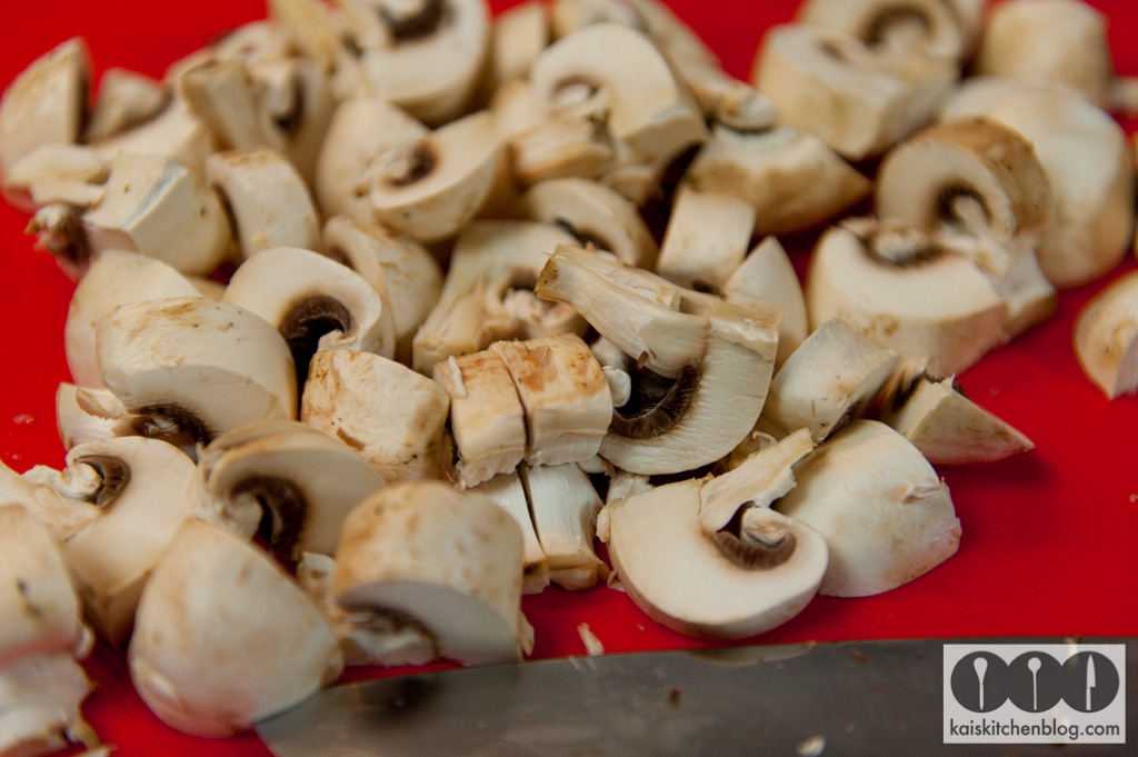 Die Schalotten zusammen mit der Butter in eine Pfanne geben und anbraten, bis sie gar sind. Aus der Pfanne nehmen und beiseite stellen. Die Champignons waschen und vierteln / sechsteln, je nach Größe der Pilze.