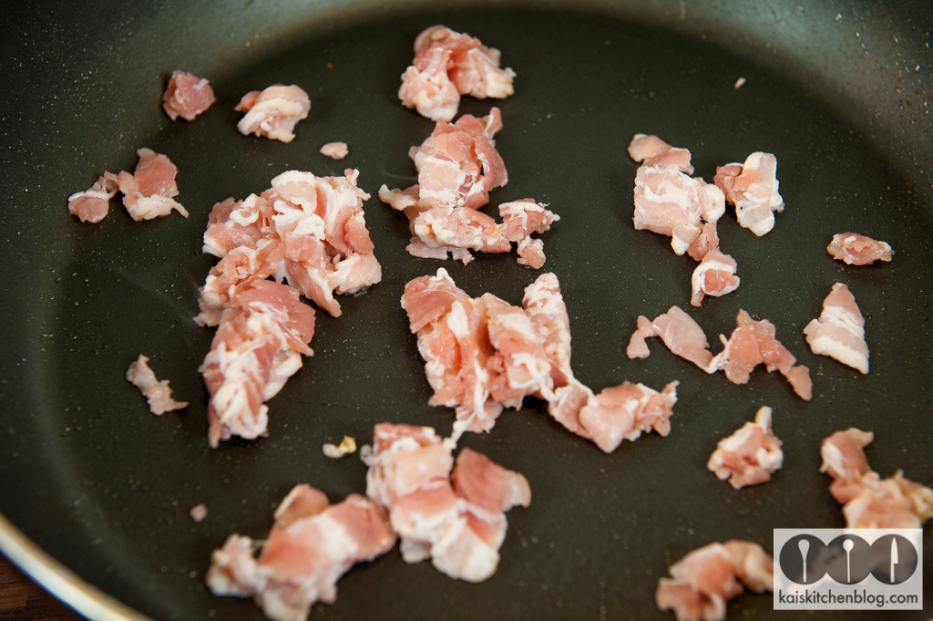 Dann die Champignons mit ein wenig Öl in der Pfanne goldbraun anbraten. Aus der Pfanne nehmen und beiseite stellen. Die Bacon Scheiben in feine Streifen schneiden und auch in Pfanne geben und goldbraun anbraten.
