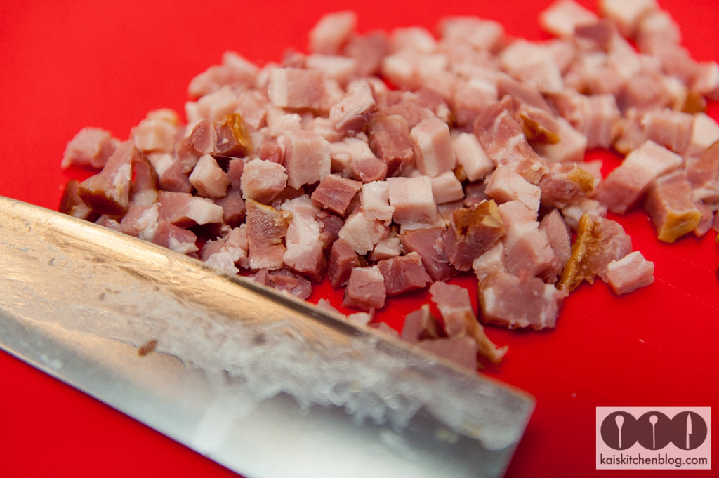 Den Bauchspeck und die Zwiebeln fein würfeln. Mit ein wenig Öl die Speckwürfel in den Bräter geben und goldbraun anbraten.