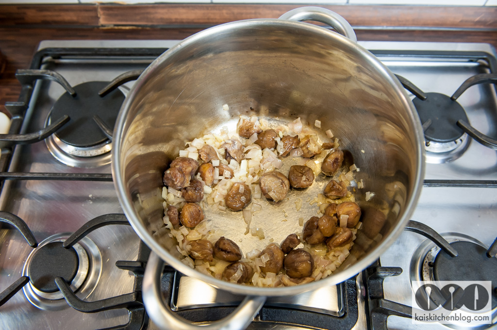 Dann die ganzen Maronen dazu geben und ordentlich mit anschwitzen. Dann mit dem Weißwein ablöschen. Die Sahne, die Butter und die Brühe dazu geben und zum Kochen bringen.
