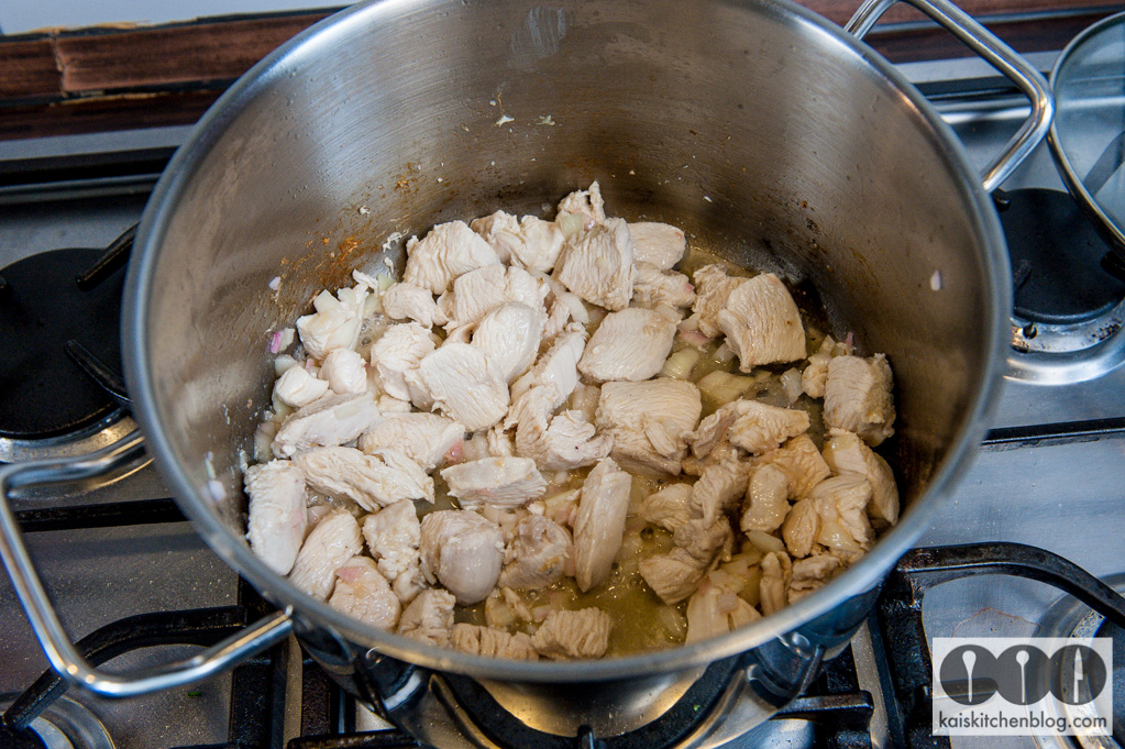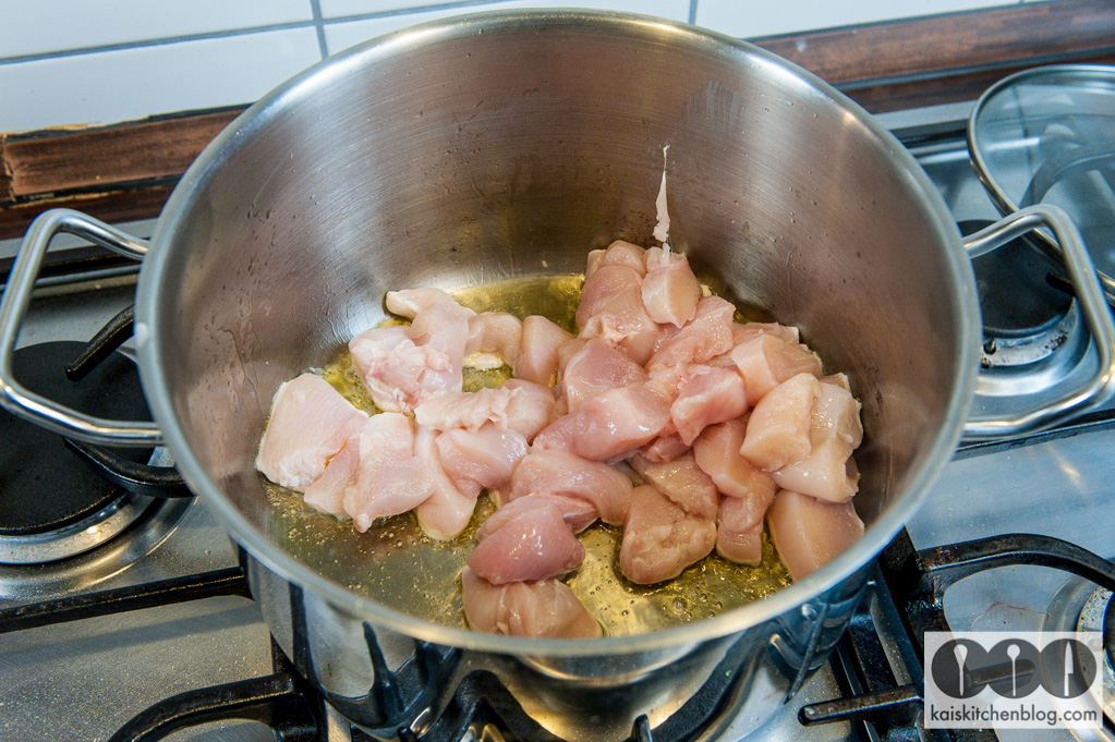 Das Hühnchen waschen und in mundgerechte Stücke schneiden. Mit einem ordentlichen Schuss Olivenöl in einem großen Topf anbraten, bis es ganz leicht gebräunt ist. Dann die fein geschnittene Zwiebel dazu geben und mit anbraten.