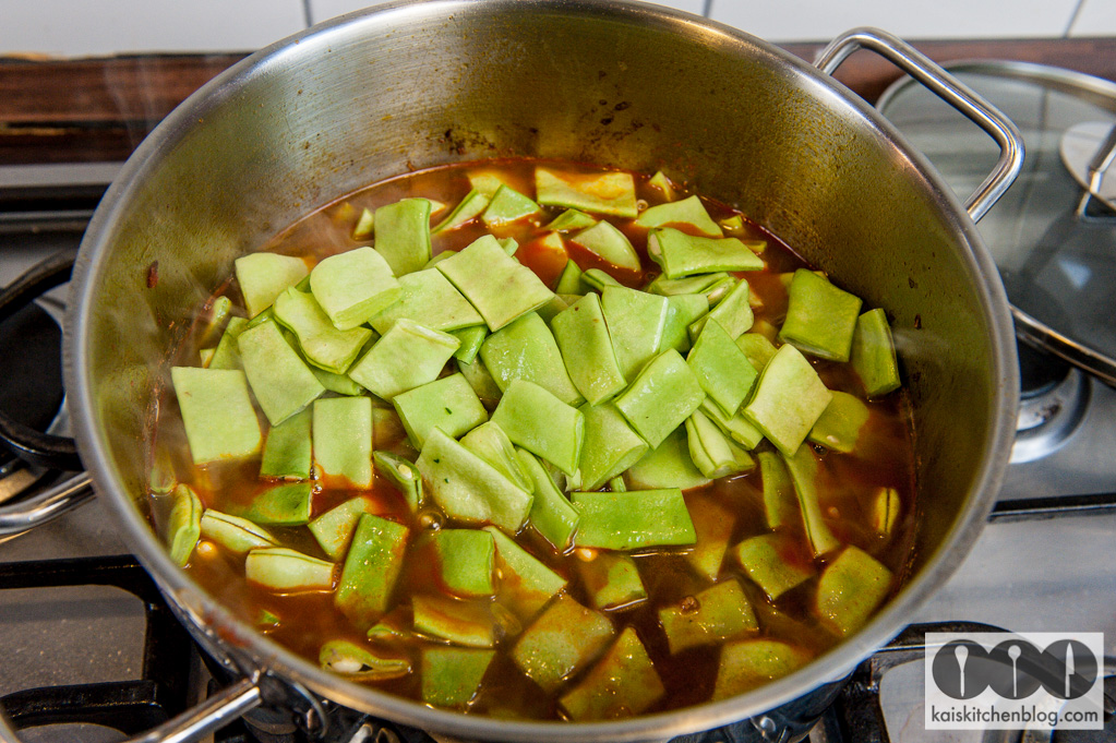 Gut 2,5 Liter Wasser dazu geben und kurz aufkochen. Währenddessen die Bohnen waschen, die Enden abschneiden und in mundgerechte Stücke schneiden. Dann mit in den Topf geben. Kochen, bis die Bohnen noch bissfest sind. Die Creme Fraiche dazu geben und gut durchrühren.