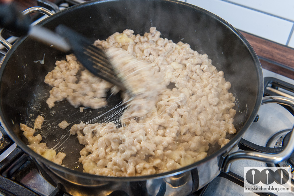 Die abgeschreckten Spätzle in geschmolzener Butter schwenken und mit dem geriebener Käsemischung vermischen, bis es Fäden zieht.