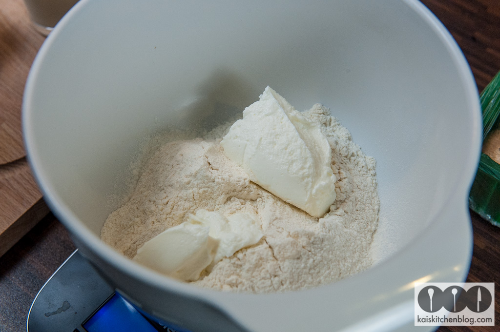 Mehl, Quark, Eier, Milch und ein Teelöffel Salz zu einem lockeren Teig mischen. Ein Paar Minuten ruhen lassen.
