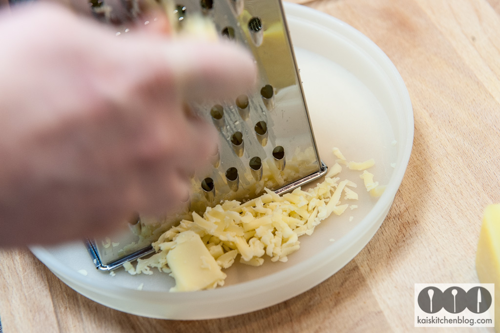 Während der Ruhzeit des Teiges beide Käsesorten reiben und gut vermischen.