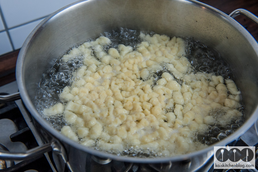 Desweiteren die Champignons säubern und kleinschneiden. Den Teig durchrühren und in kochendem Salzwasser auskochen. Auch wenn sie schon schwimmen noch einen Augenblick kochen lassen. Mit einem Schaumlöffel die garen Spätzle ernten und mit kaltem Wasser abschrecken.