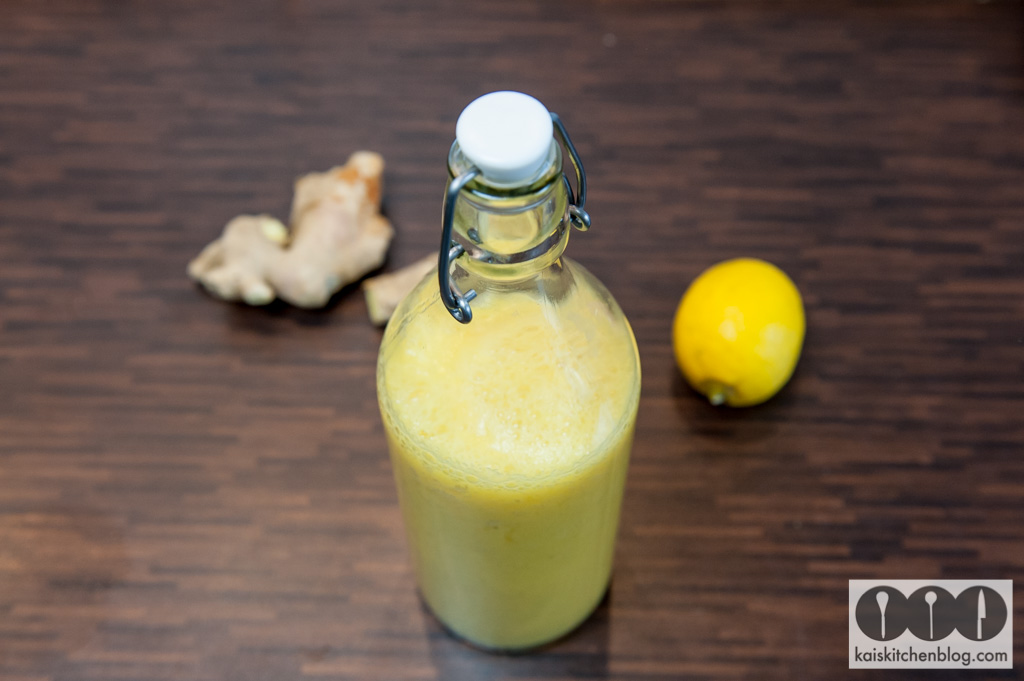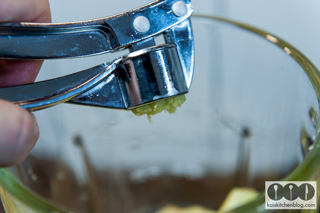 Den Ingwer schälen und in grobe Scheiben schneiden. Dann mit einer Knoblauchpresse den Saft auspressen, der Rest wird nicht gebraucht.