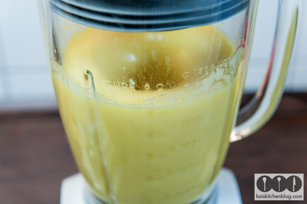 Die Limette und die Zitrone auspressen und mit in den Mixer geben. Dann den Orangensaft dazu geben.