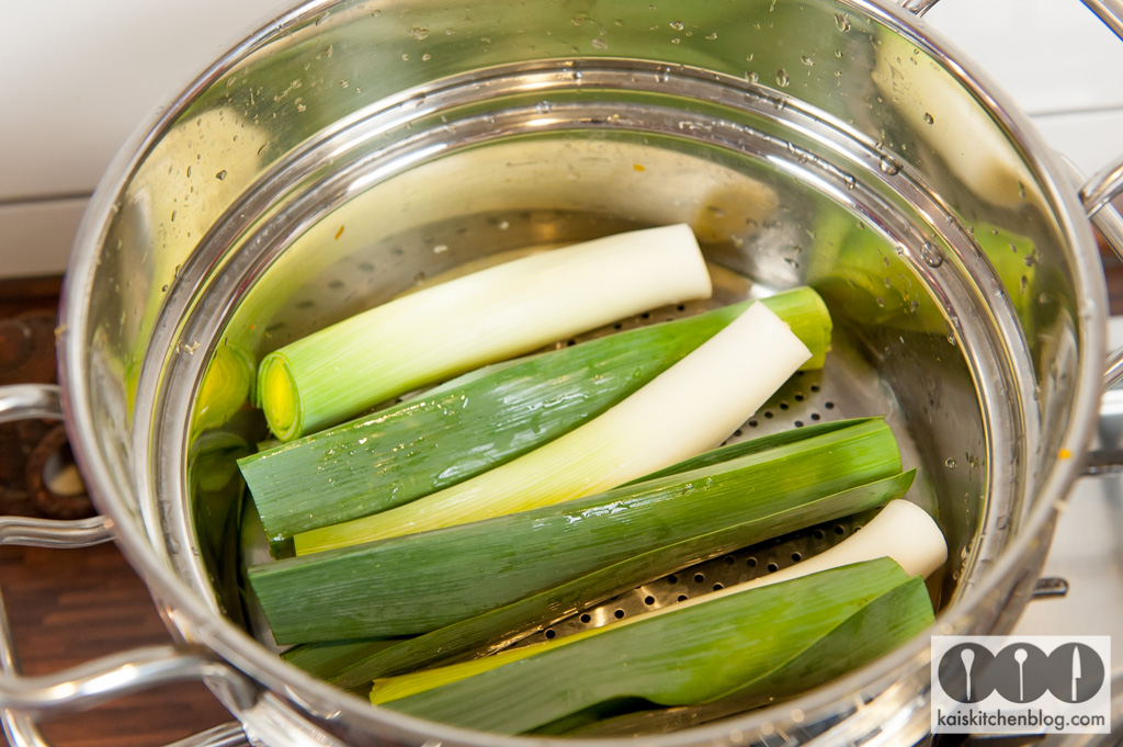 Das Lauch gründlich waschen, die äußeren Blätter abziehen und trockene Stellen abschneiden. Wichtig ist es auch von oben ordentlich durch zu spülen, damit eventuelle Erde ausgewaschen wird. Dann den Strunk halbieren. Das Lauch für 10 Minuten dünsten. Sollte kein Dünst-Einsatz für den Kochtopf vorhanden sein, kann das Lauch auch für 5 Minuten in heißem Wasser gekocht werden. In jeden Fall muss das Wasser gesalzen sein.