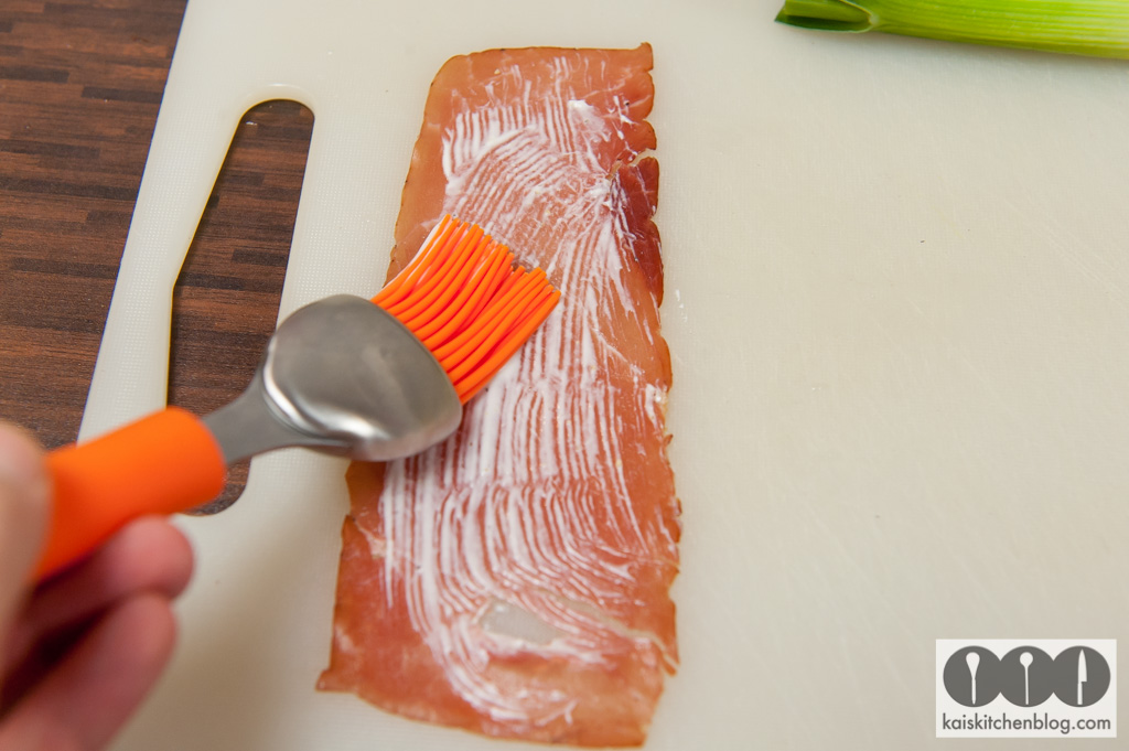 Wenn das Lauch fertig ist, werden die Schinken Scheiben einzeln ausgelegt und mit Hilfe eines Pinsels mit der Soße bestrichen. Dann leicht schräg jeweils zwei Scheiben um eine Stange Lauch wickeln und in eine Auflaufform legen.