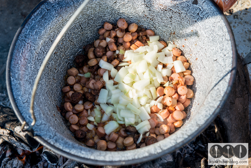 Für die Zubereitung sollten alle Zutaten im Vorfeld zubereitet sein, damit man dann an der Feuerstelle alles griffbereit hat. Dazu die Zwiebeln grob würfeln.
