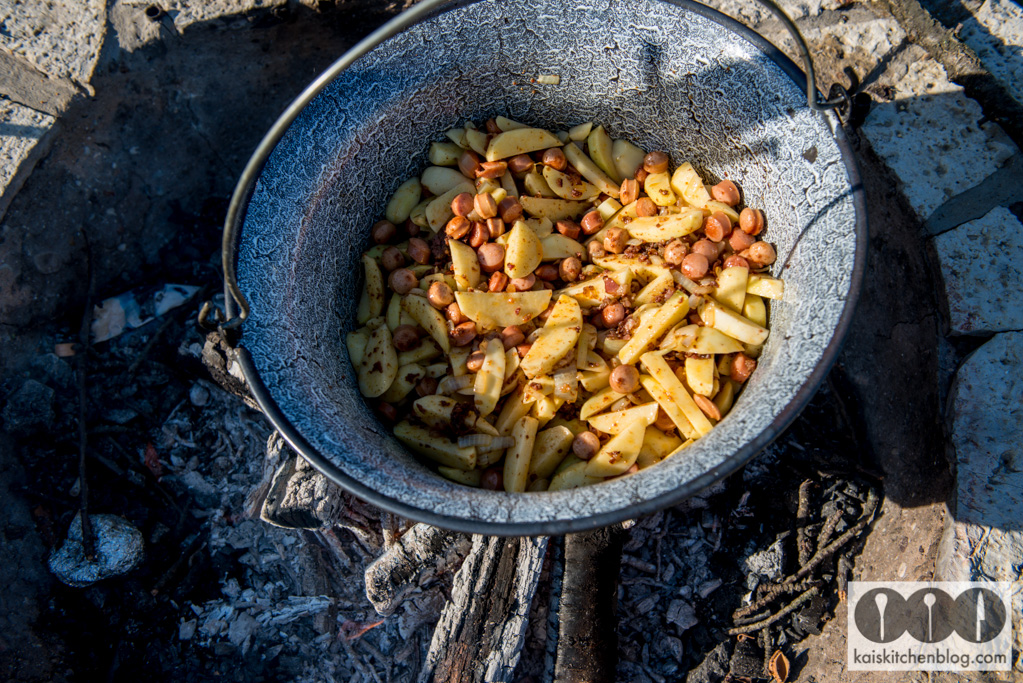 Den Kobasz in dünne Scheiben schneiden (ca. 5mm). Die Kartoffeln schälen und dann halbieren und die Hälften dann noch mal dritteln. Alles zur Feuerstelle mit nehmen und auch reichlich Wasser zum Ablöschen bereit halten.