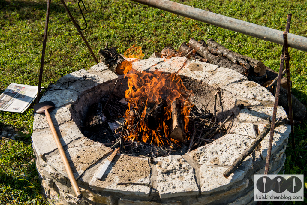Dann ein ordentliches Feuer vorbereiten. Am besten geht es mit einem schönen Holzfeuer, aber Holzkohle in der Feuerschale tut es auch. Wichtig ist nur, dass es ordentlich heiß ist. Beim Holzfeuer sollte eine schöne Flamme unter dem Kessel stehen.