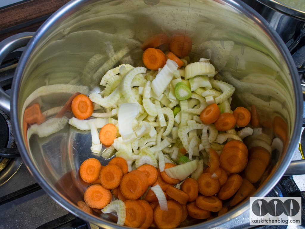 Die Karotten in Scheiben schneiden. Die Basis des Fenchels abschneiden und die Strünke in dünne Scheiben schneiden, das sieht so ähnlich aus wie bei einer Zwiebel (siehe Foto). Beides in einem Topf in heißem Öl anschwenken.
