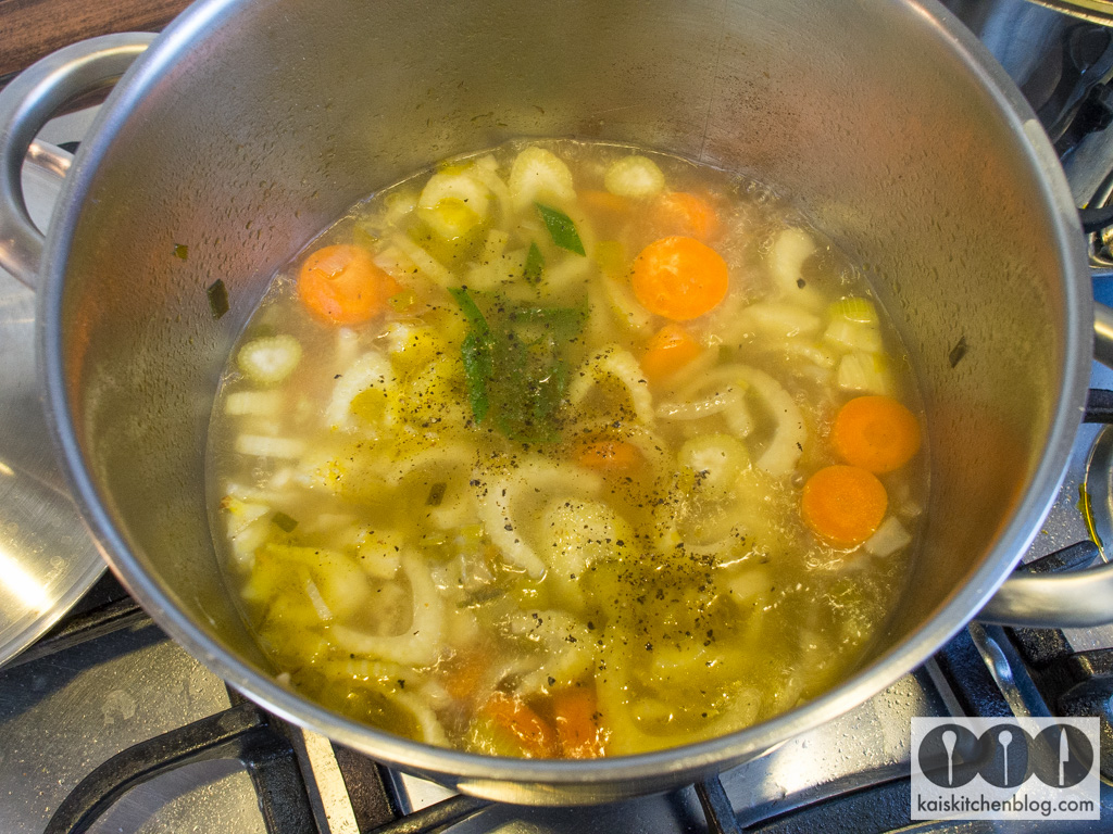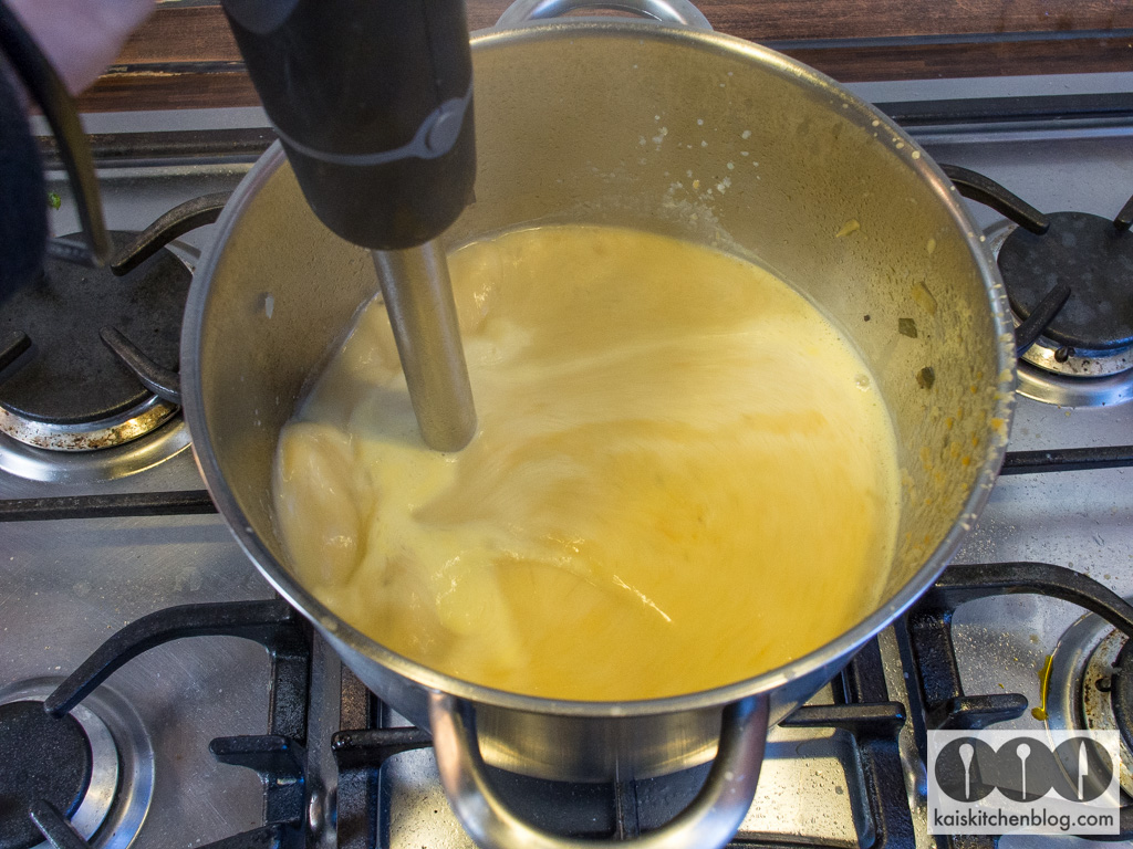 Mit dem Wasser auffüllen – darf auch etwas mehr sein als ein Liter. Halt so, dass genügend Flüssigkeit im Verhältnis zur Menge des Fenchels vorhanden ist. Dann mit Salz und Pfeffer abschmecken und die Creme Fraiche dazu geben. Mit dem Pürierstab Deiner Wahl schön fein durch pürieren – fertig.