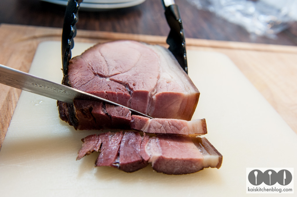 Damit der Schinken nicht zu salzig wird, sollte man ihn vor der Zubereitung 1 1/2 Stunden wässern. Also schlicht in eine Schale mit Wasser legen, damit ein wenig vom Salz entzogen wird.