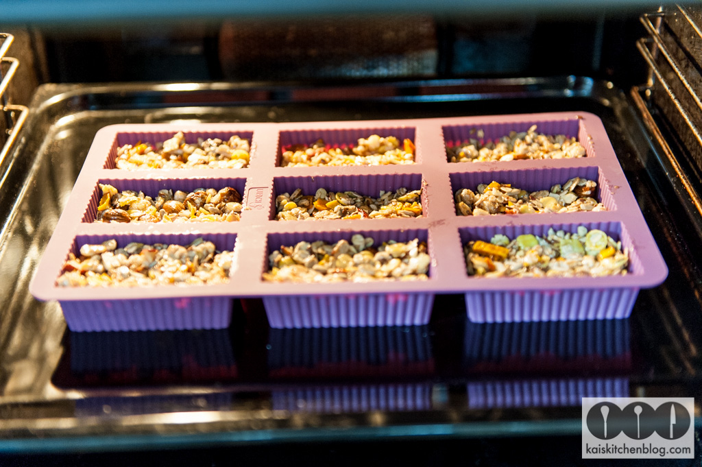 Schließlich die Cranberries klein schneiden und zusammen mit den Rosinen in den Rest der Masse geben. Wieder gut durchrühren und in die Silikonform geben, wenn diese wieder frei ist. Auch bei 160 Grad für 20 Minuten backen.