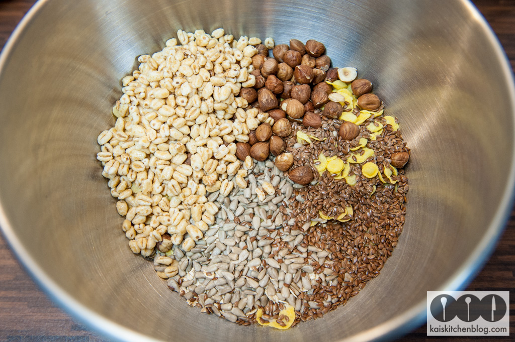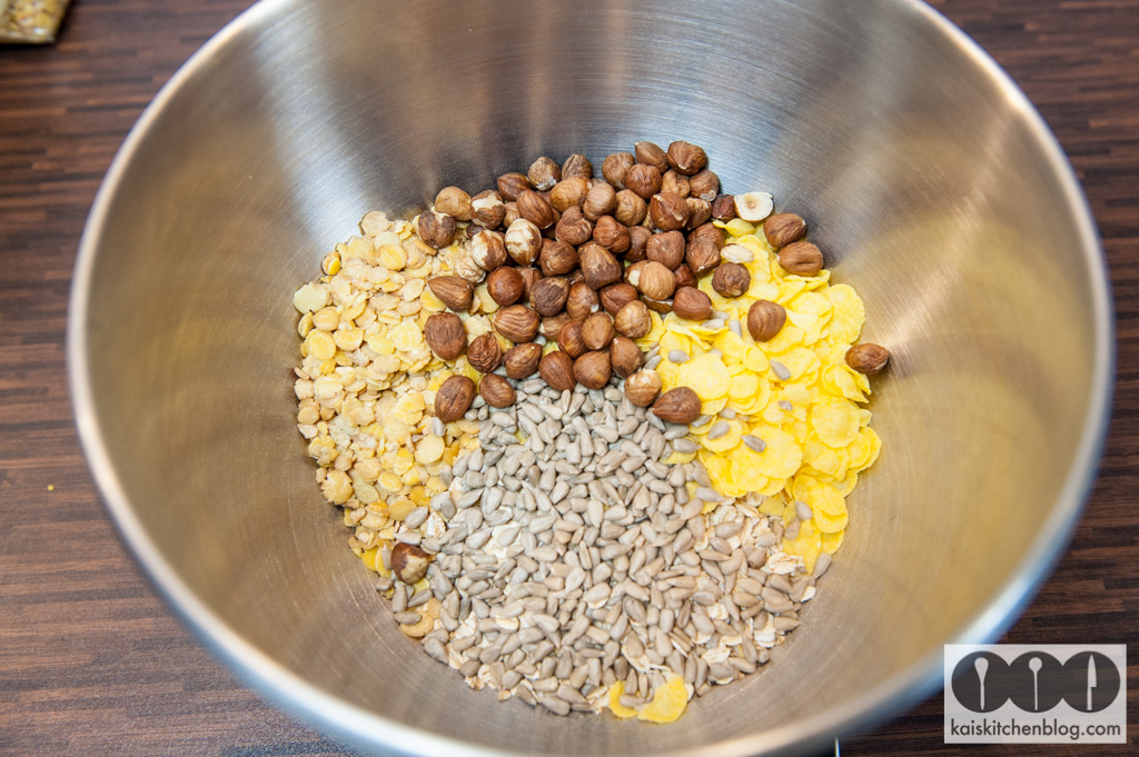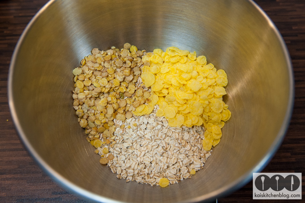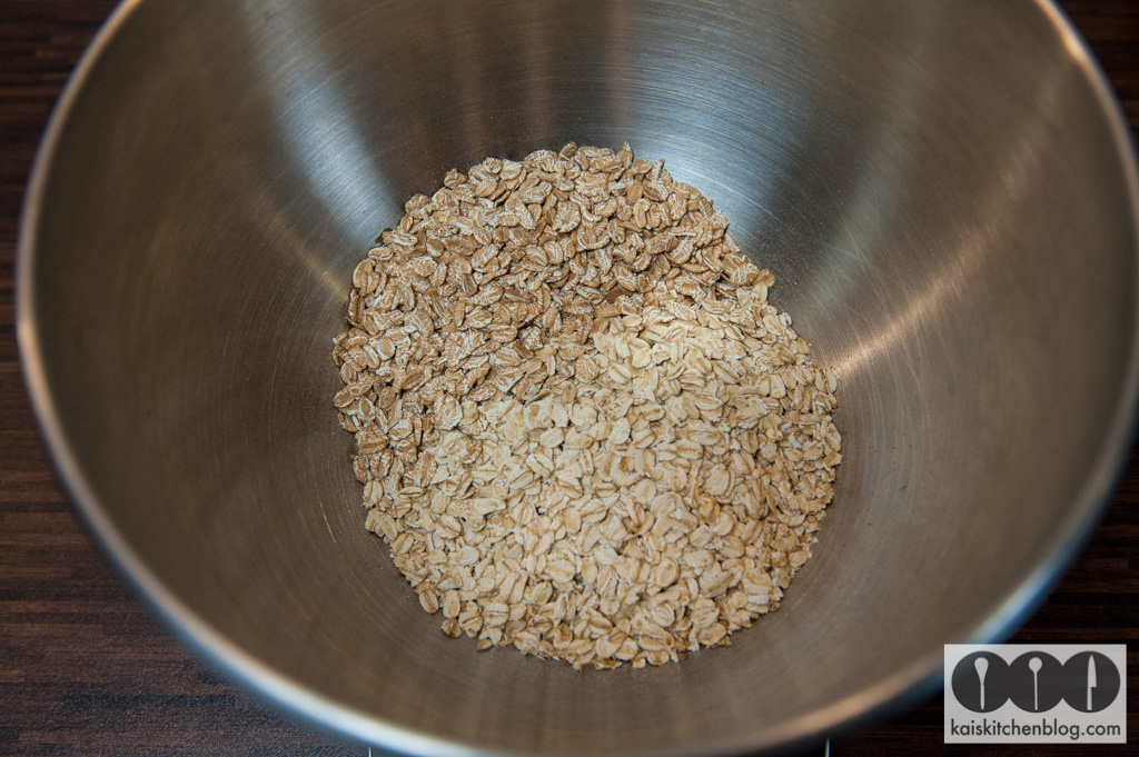 Zuerst die Hafer- und Dinkelflocken in eine ausreichend große Schüssel geben.