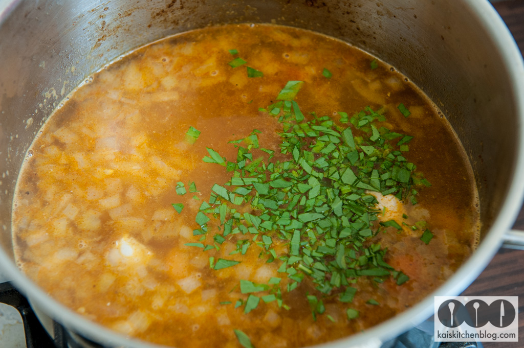 Das Hühnerbrustfilet in kleine Stücke schneiden und mit einem guten Schuss Olivenöl in einem großen Topf anbraten. Dann die Zwiebel fein klein scheiden und mit dazu geben und anbraten. Dann auch die Karotten und den Kohlrabi klein schneiden.