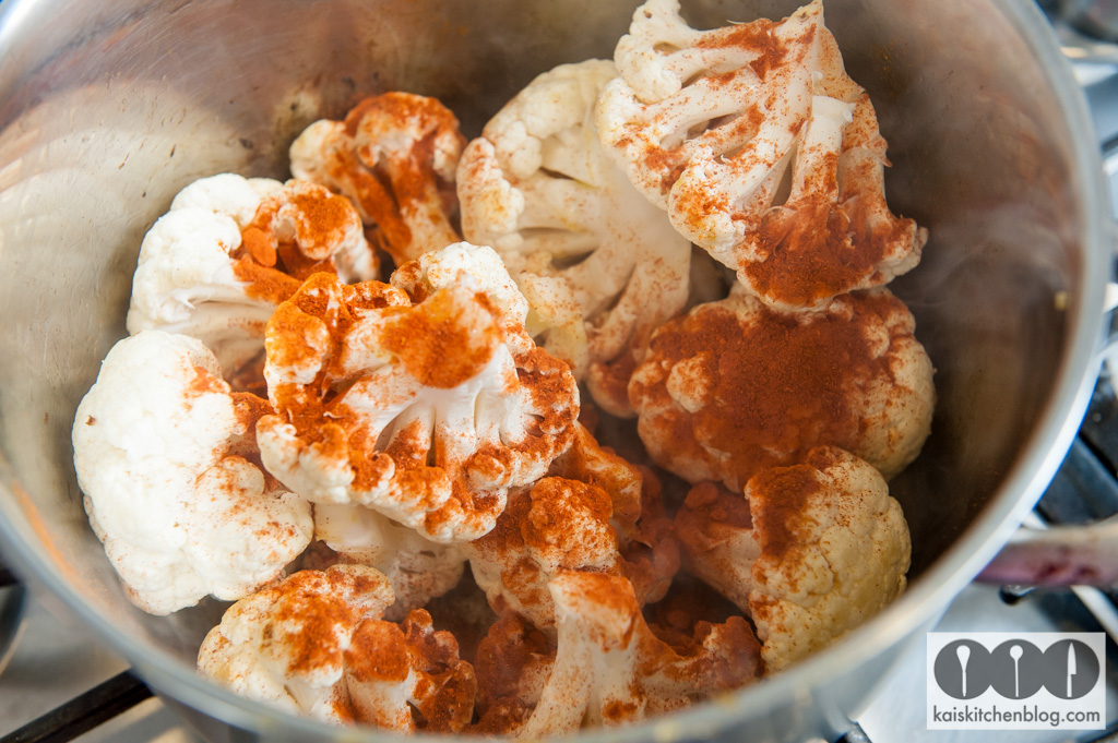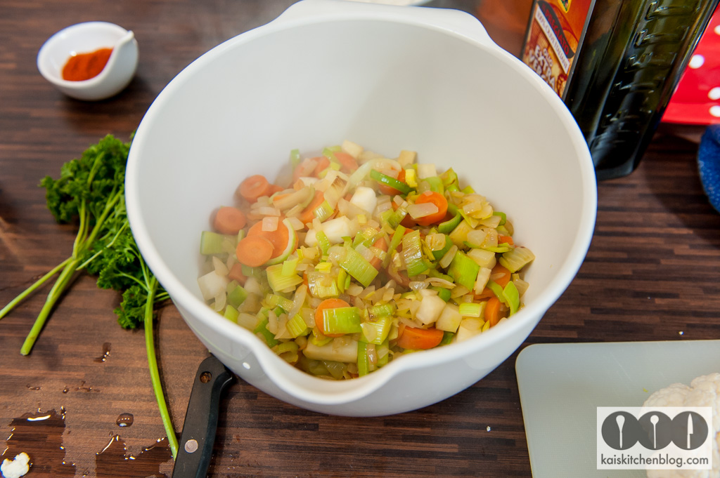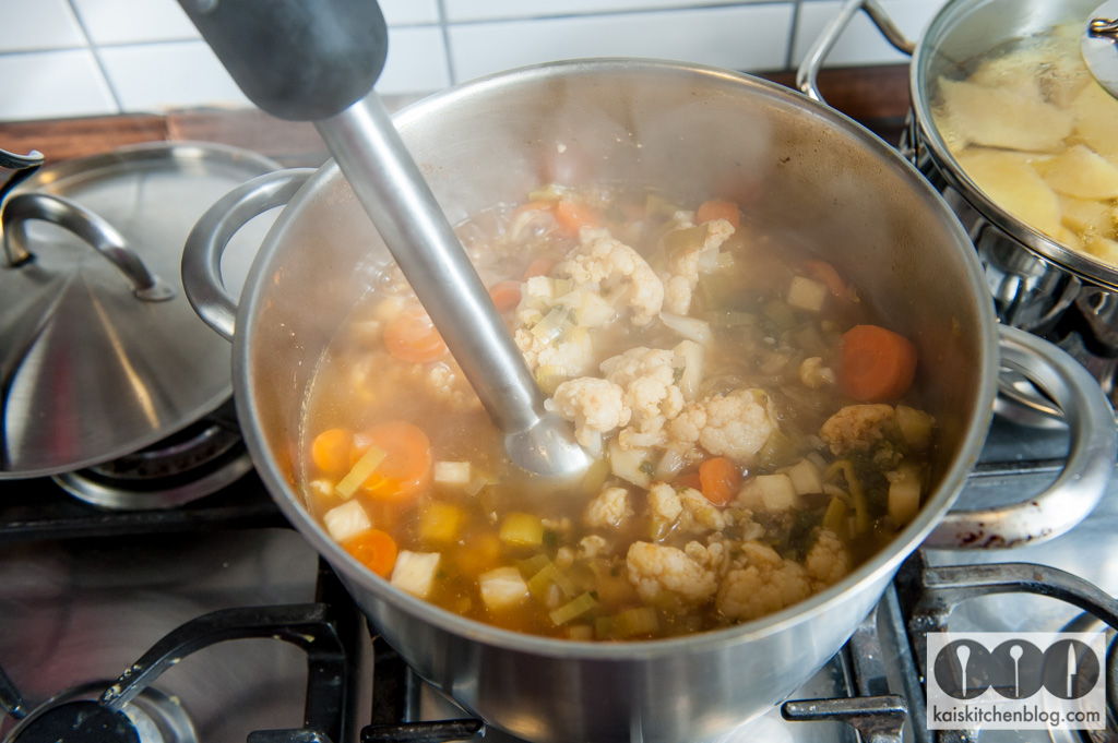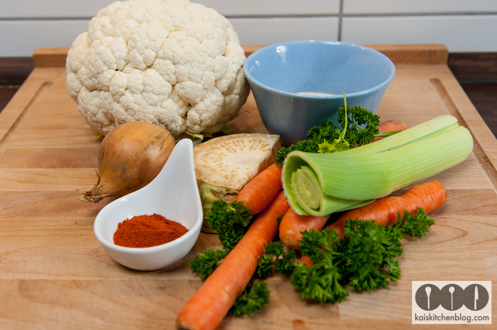 Den Blumenkohl vom Strunk befreien und grob in Röschen teilen. Etwas Olivenöl in den Topf geben und den Blumenkohl darin ein wenig anschwitzen. Dann mit dem Paprikapulver bestäuben und mit ca. 1,2 Liter ablöschen. Das Suppengrün mit dazu geben.