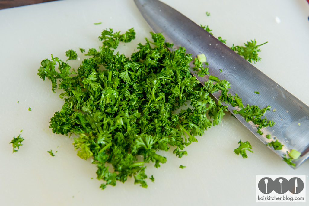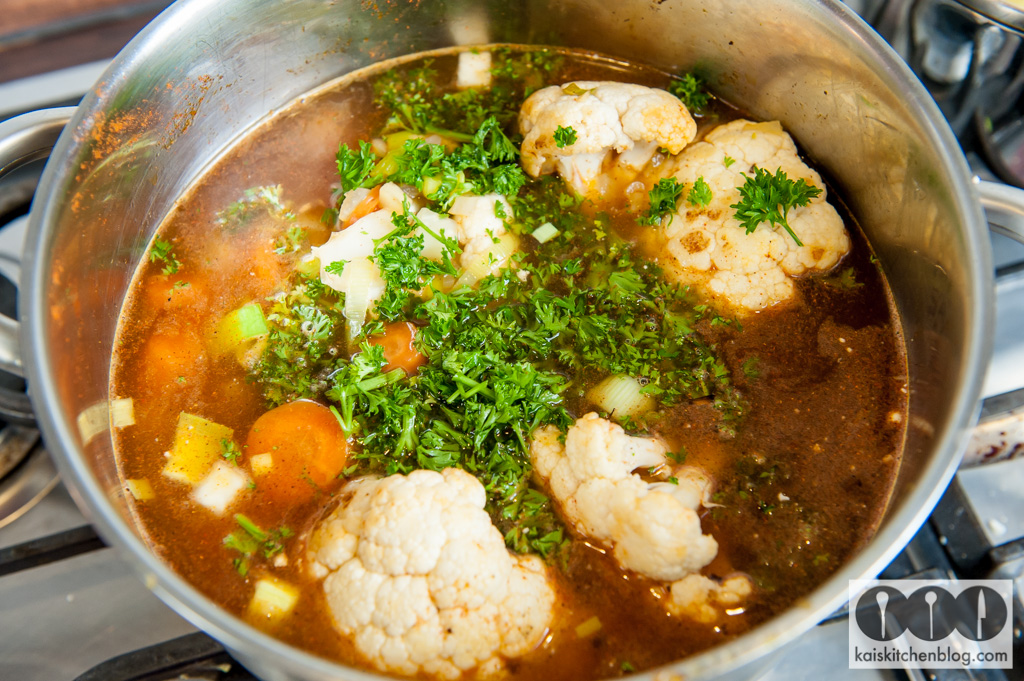 Dann die Petersilie fein schneiden und mit in den Topf geben. Das Ganze auf kleiner Flamme für etwa 20 kochen (bis der Blumenkohl weich gekocht ist).