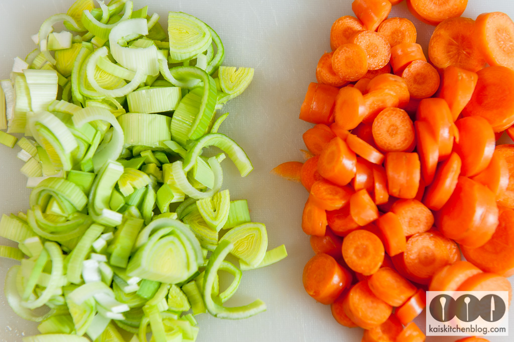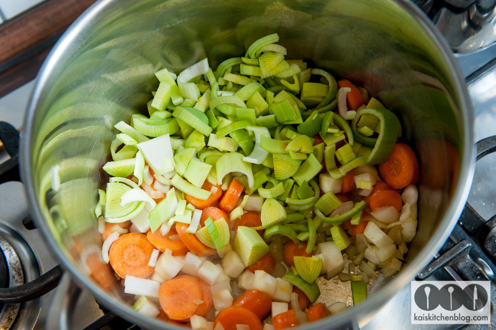 Währenddessen das restliche Suppengrün – bis auf die Petersilie – putzen und klein schneiden. Mit in den Topf geben und alles gut anschwitzen. Dann vom Herd nehmen und in eine Schale geben.