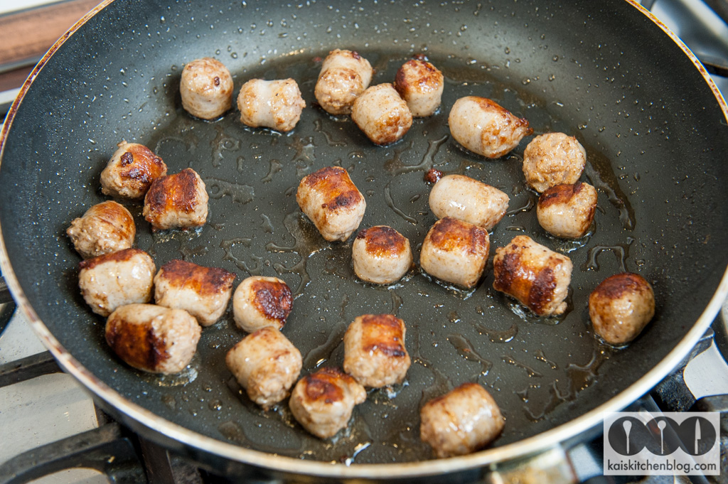 Die Tomaten in kleine Stücke schneiden. Dann die Bratwurst mit 2EL Olivenöl scharf von allen Seiten anbraten. Aus der Pfanne nehmen und beiseite stellen. Dann die Zwiebeln und den Knoblauch in der Pfanne anbraten.